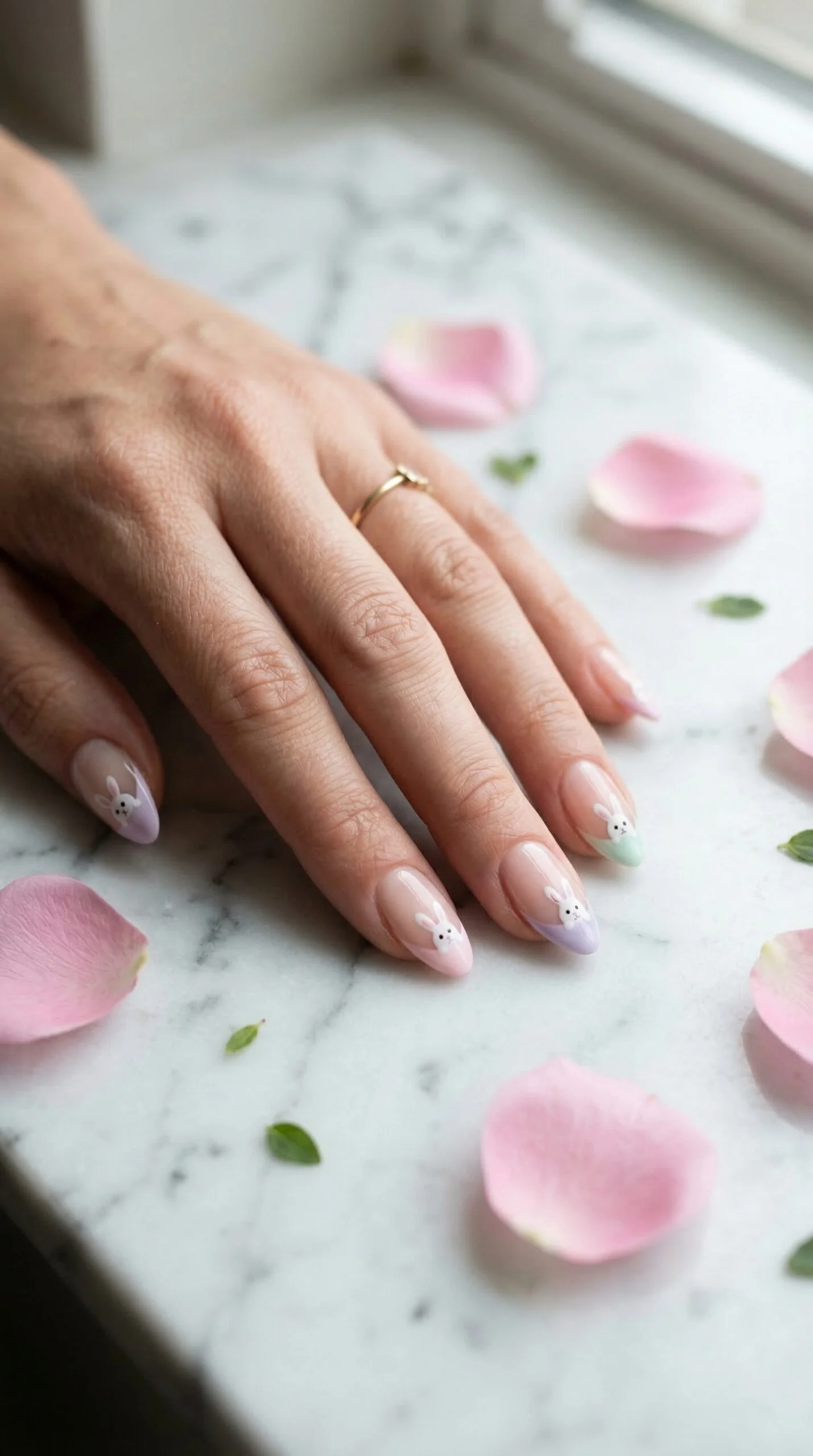 Soft pastel tips frame each nail with tiny bunny details. The glossy finish adds a playful shine.