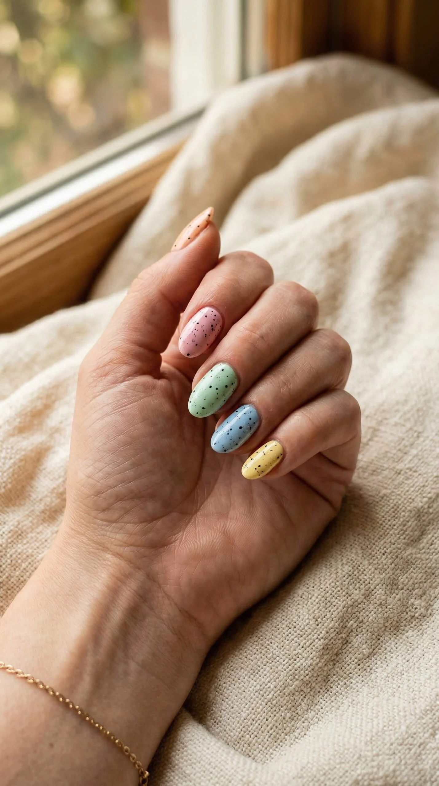 Pastel shades are dotted with delicate speckles. The effect mimics tiny Easter eggs beautifully.