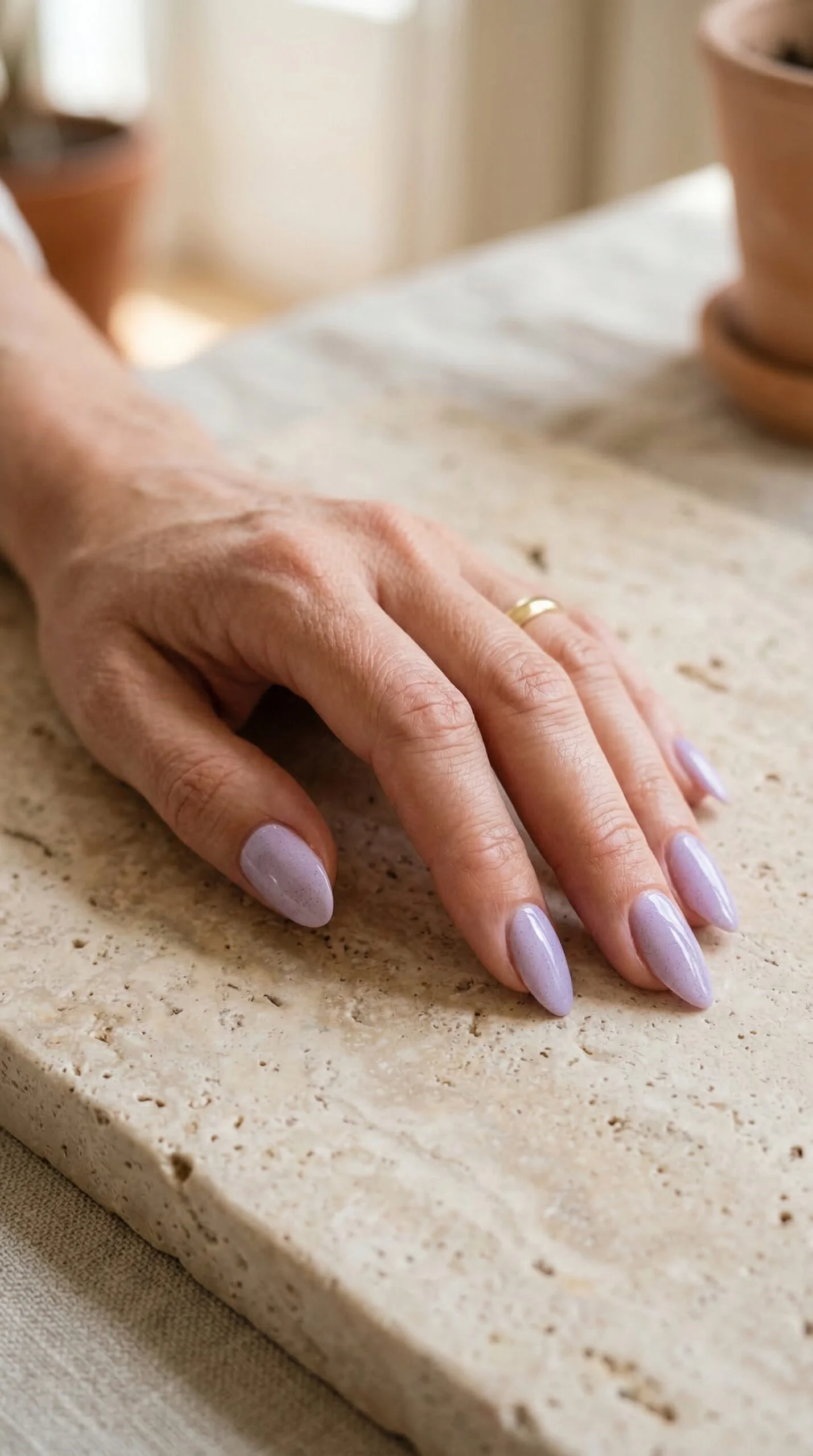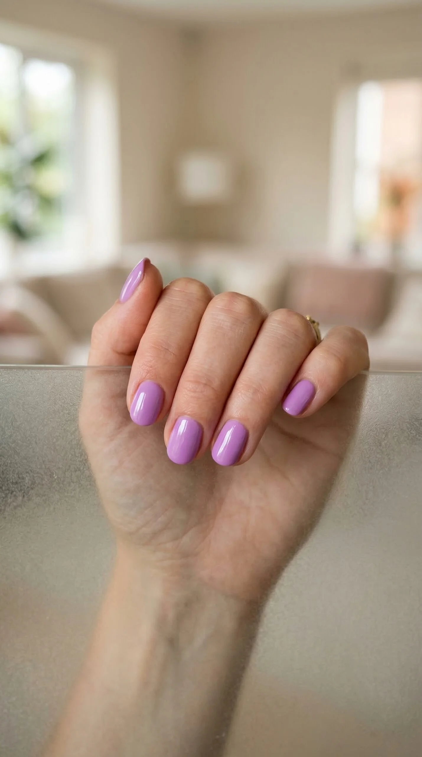 Lilac polish coats each nail evenly. The glossy finish enhances its softness.