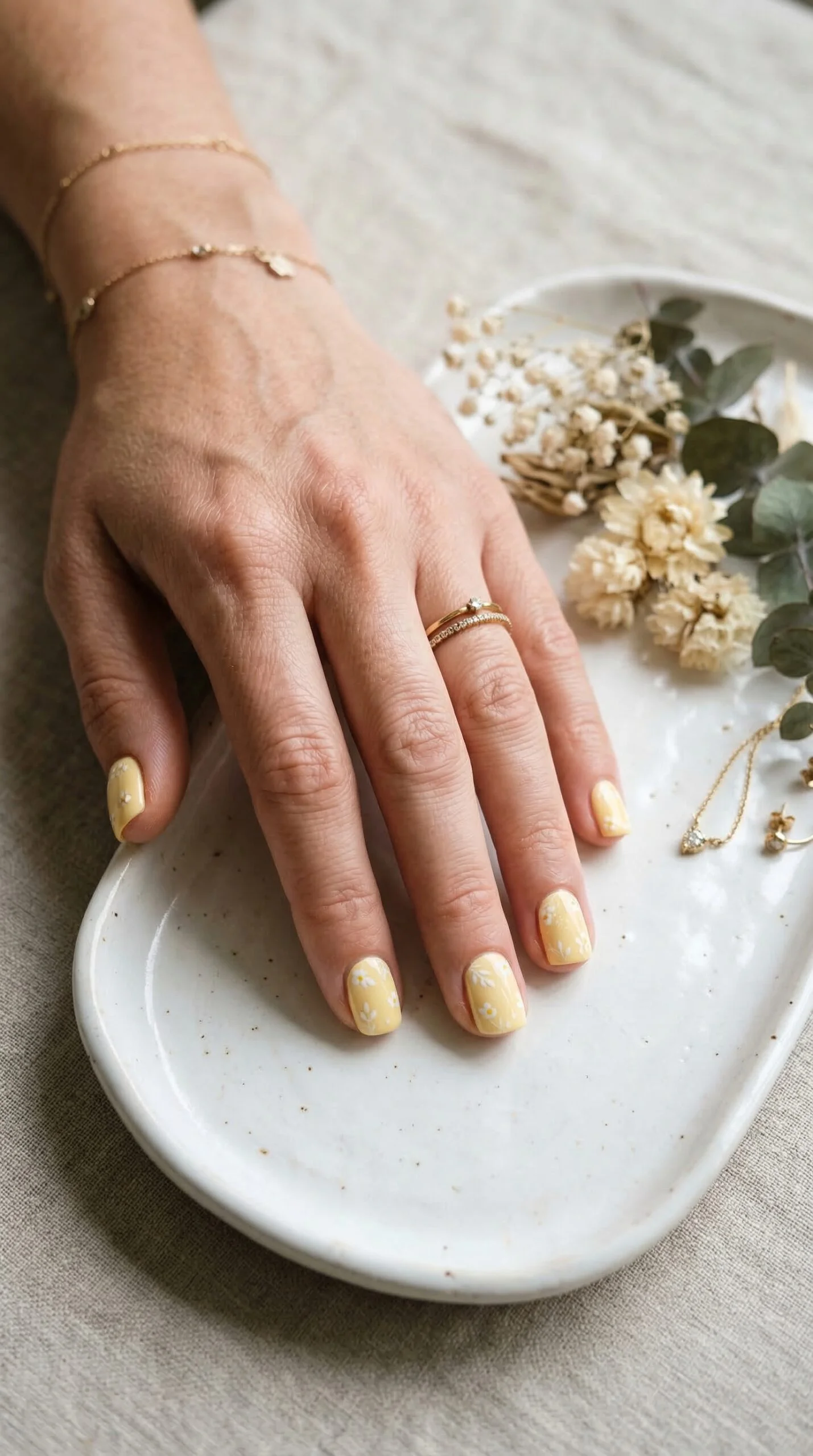 Butter yellow polish glows softly across each nail. Tiny white flowers add delicate detail.