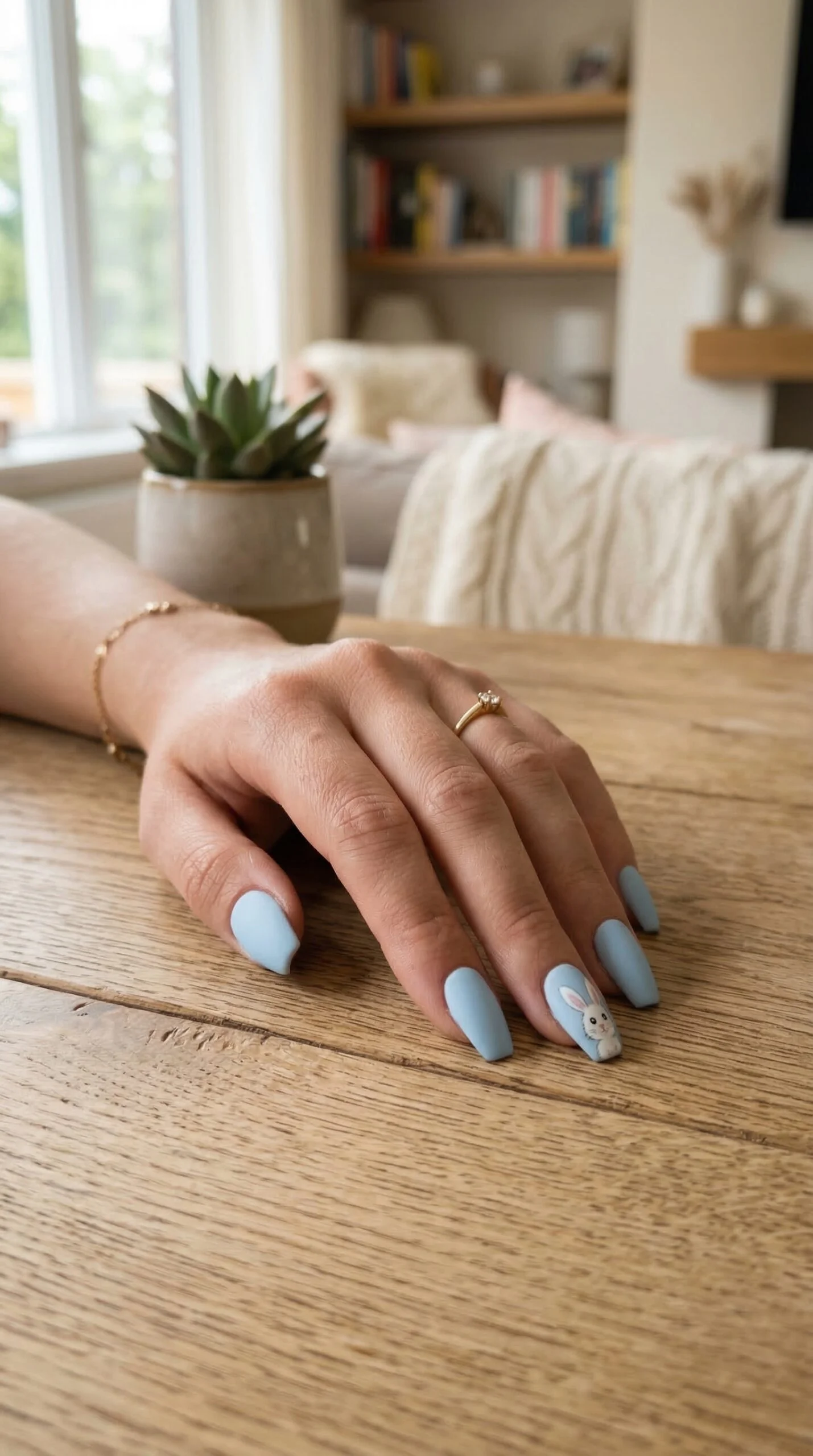 Baby blue polish creates a serene base. A single bunny accent adds charm.