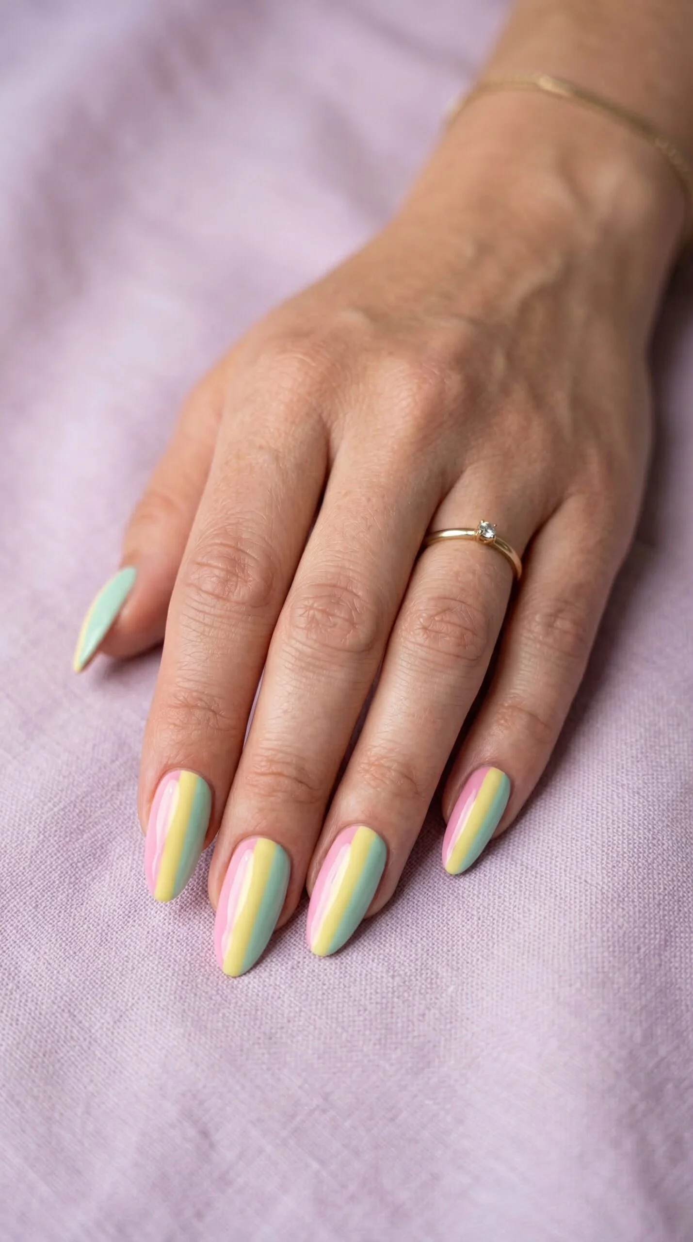 Vertical pastel stripes create a candy-like effect. Each color pops with glossy shine.