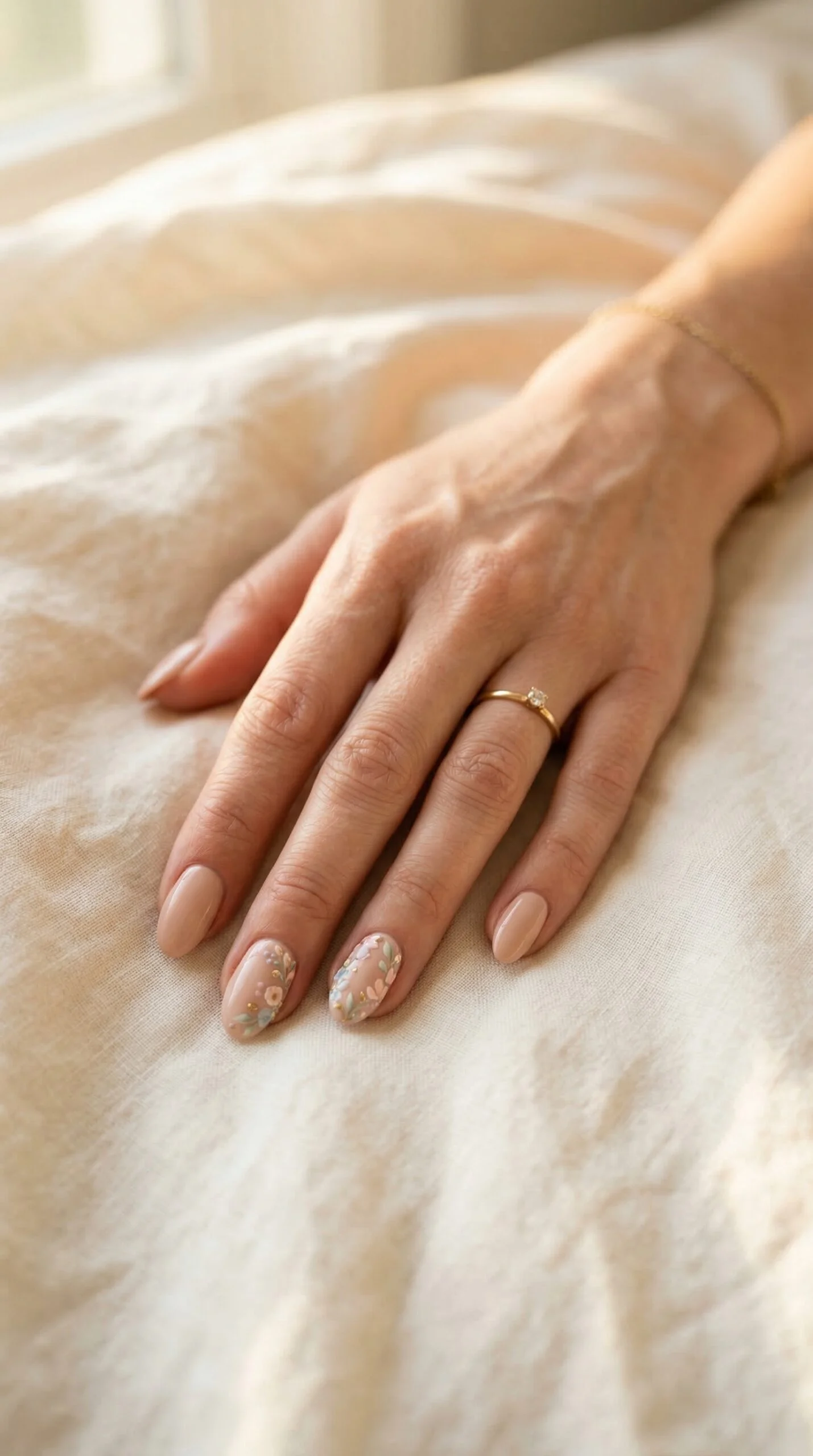 Soft nude polish is elevated with tiny pastel flowers. The design feels delicate and refined.