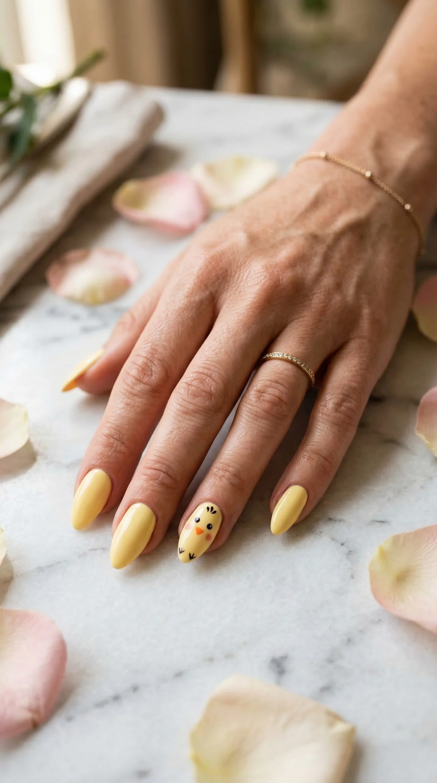 Soft yellow polish pairs with adorable chick faces. The art is tiny yet detailed.