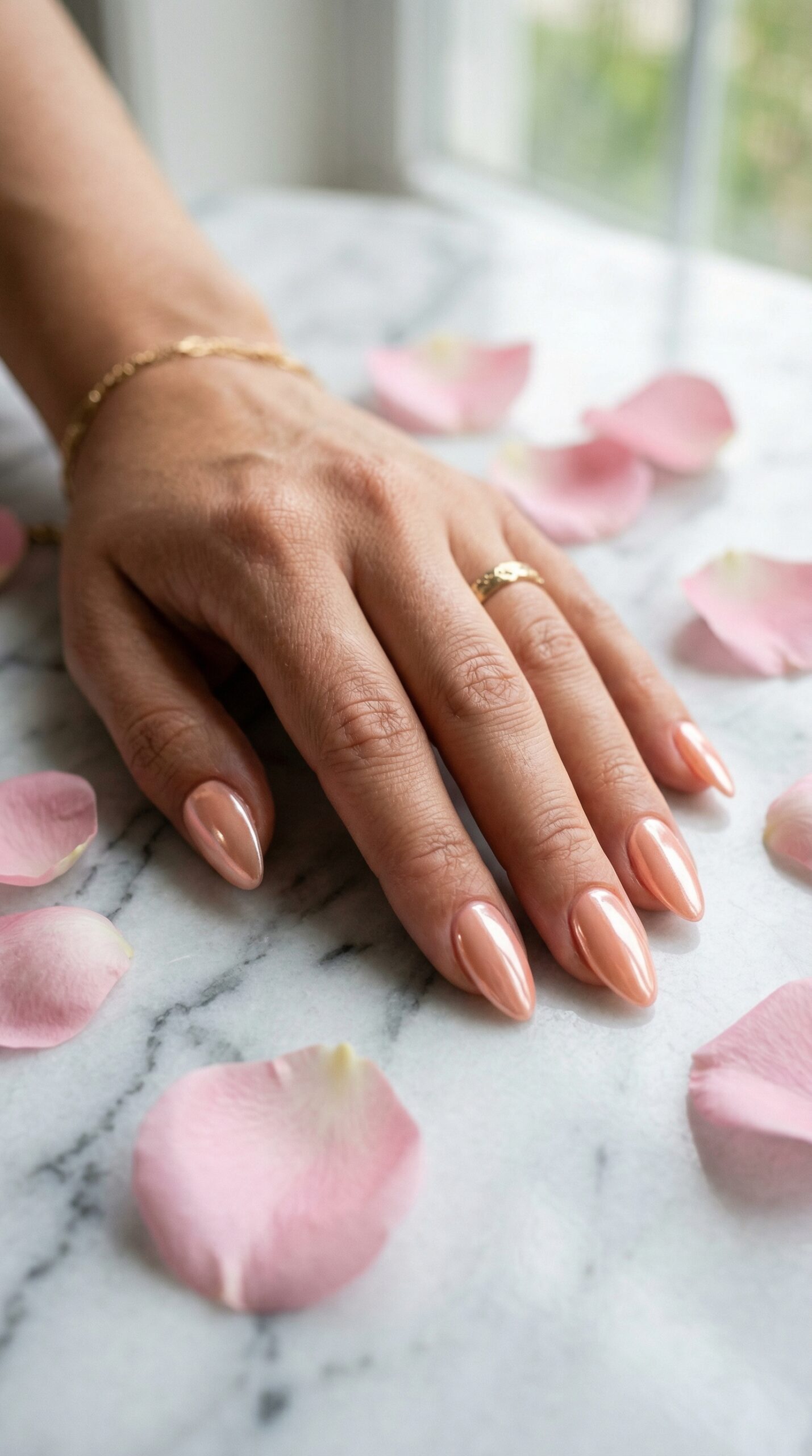 Soft peach tones melt into a reflective chrome finish. The surface looks almost liquid under light.