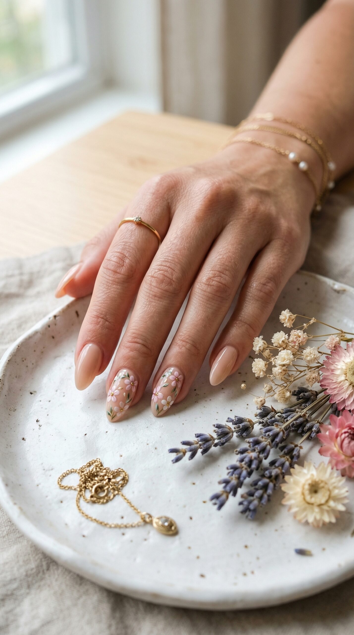 Tiny floral details sit delicately on a nude base. Each petal feels carefully placed and refined.