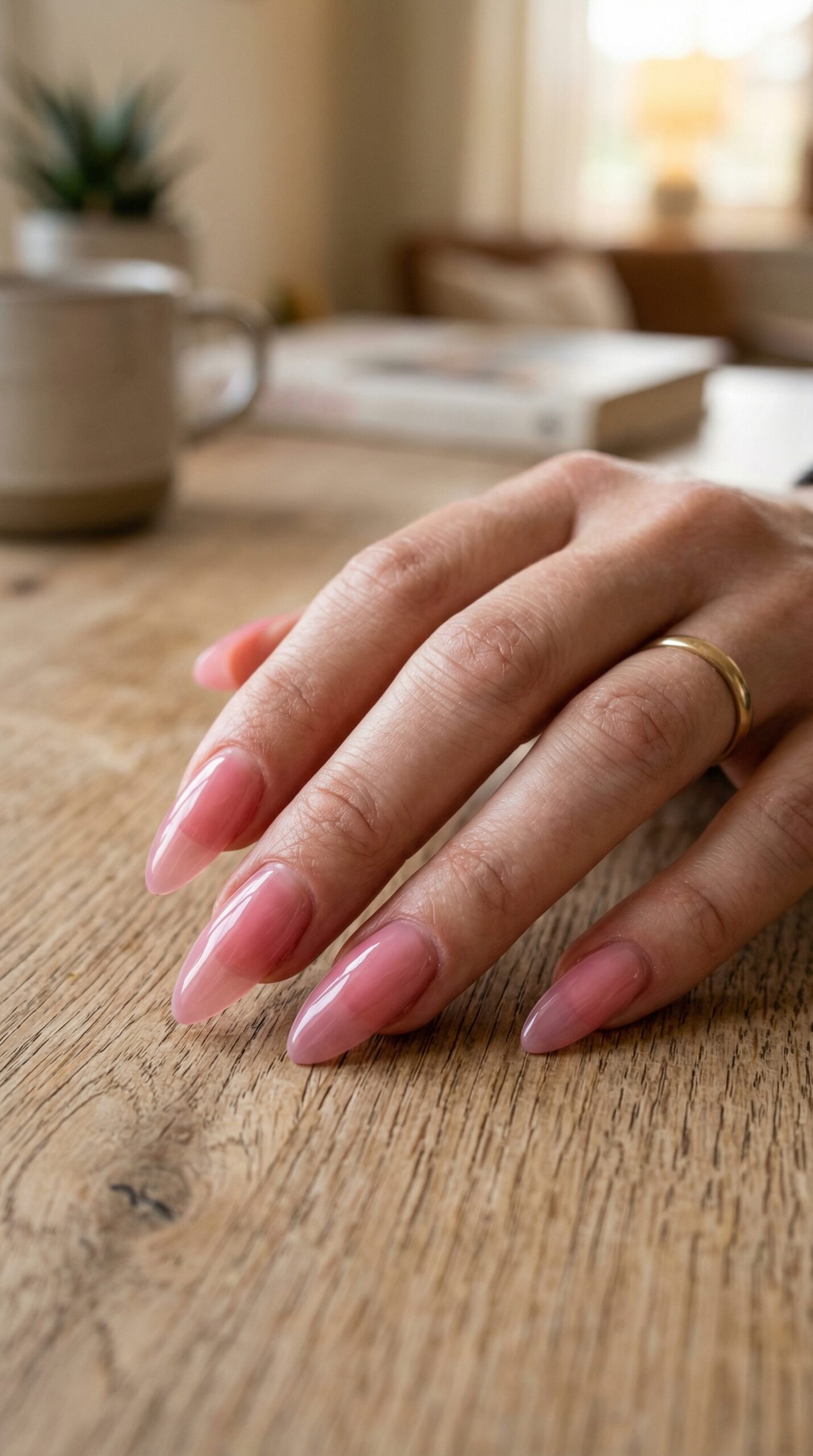 Transparent pink layers create a jelly-like effect. The nails look juicy and fresh.