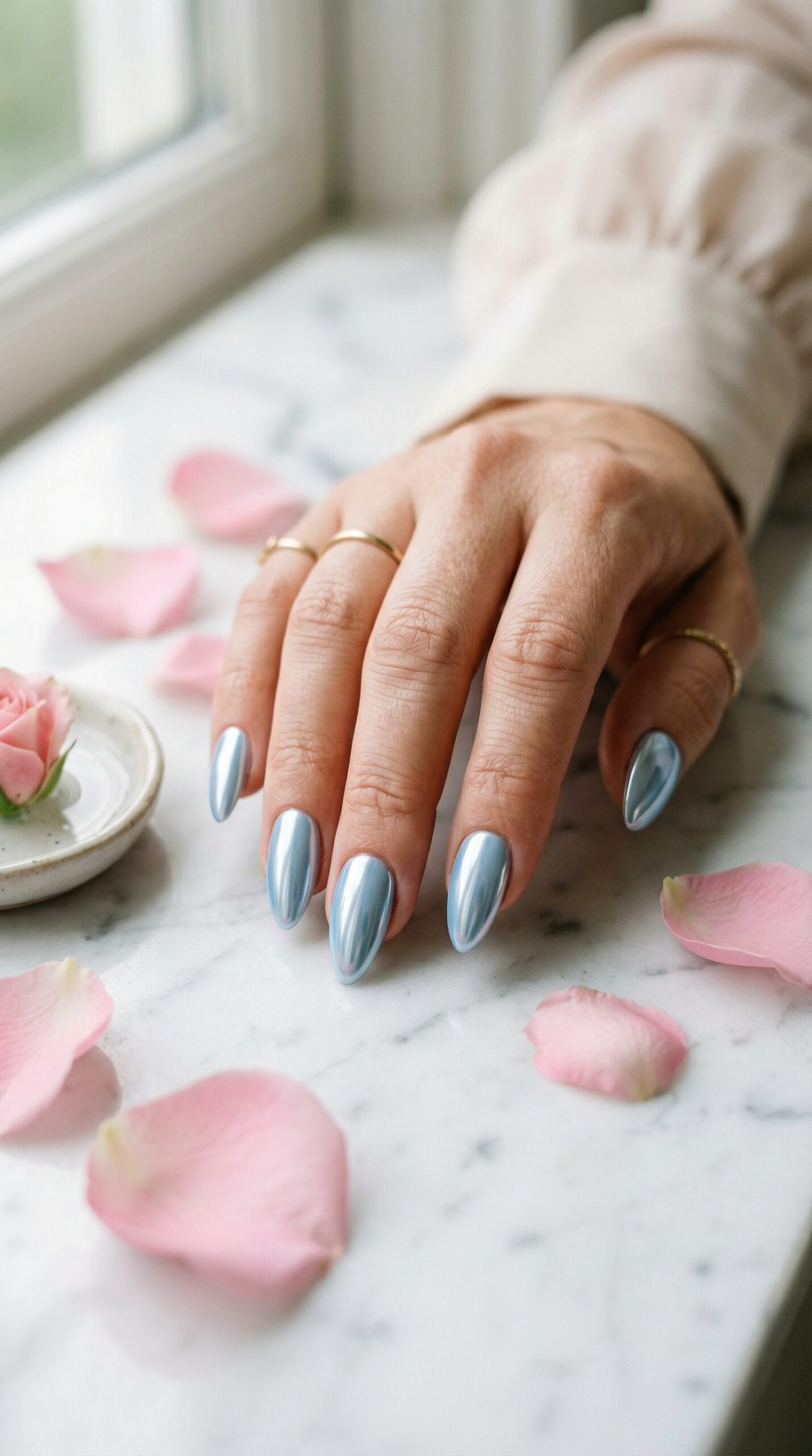 Cool blue meets chrome shine. The result feels futuristic and soft.