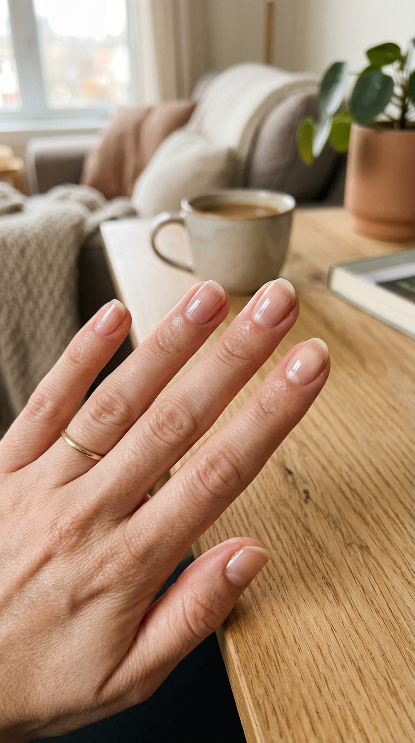 Natural nails shine with clear gloss. Clean and effortless beauty.
