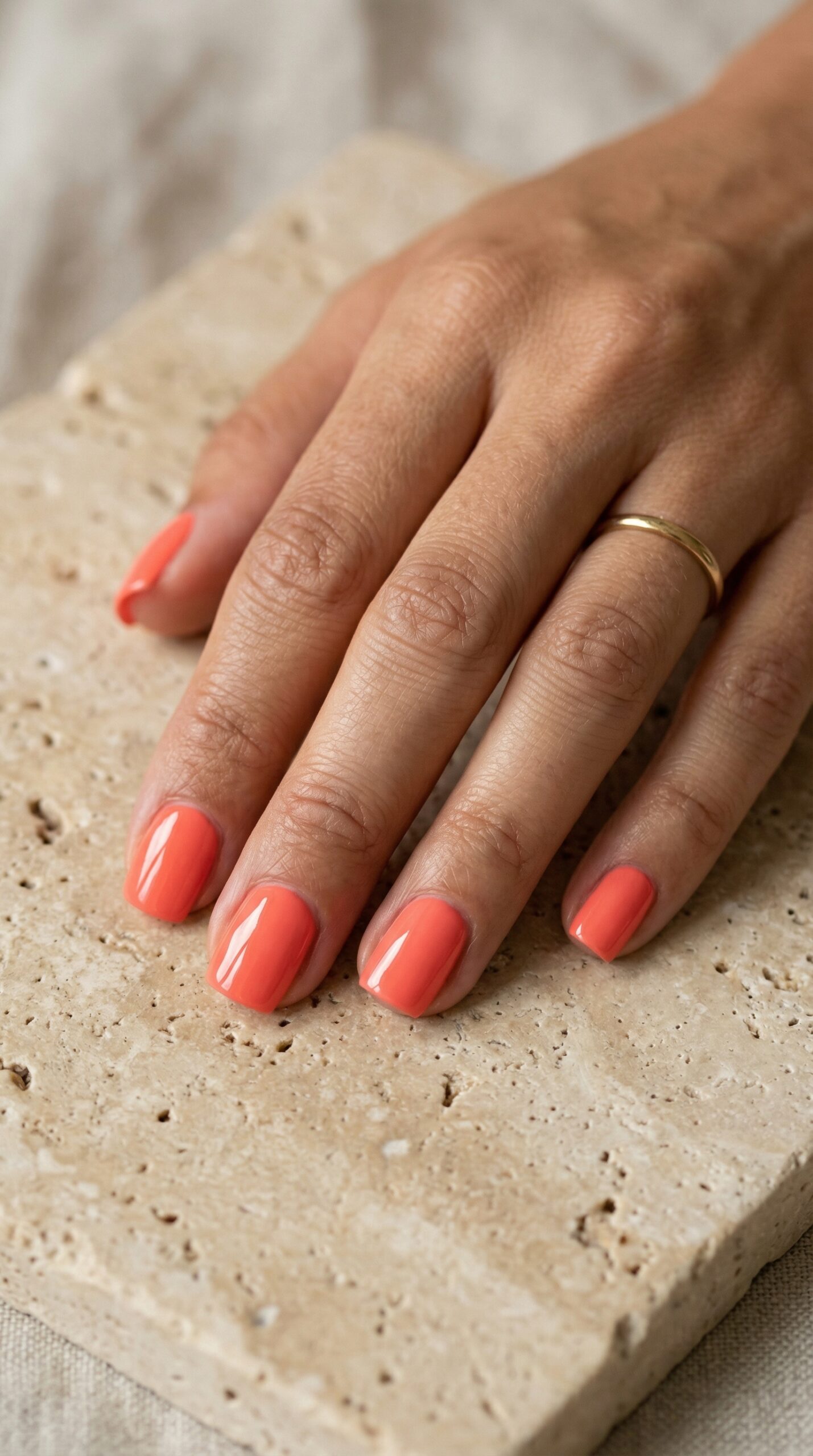 Bright coral pops instantly. The glossy finish enhances its richness.