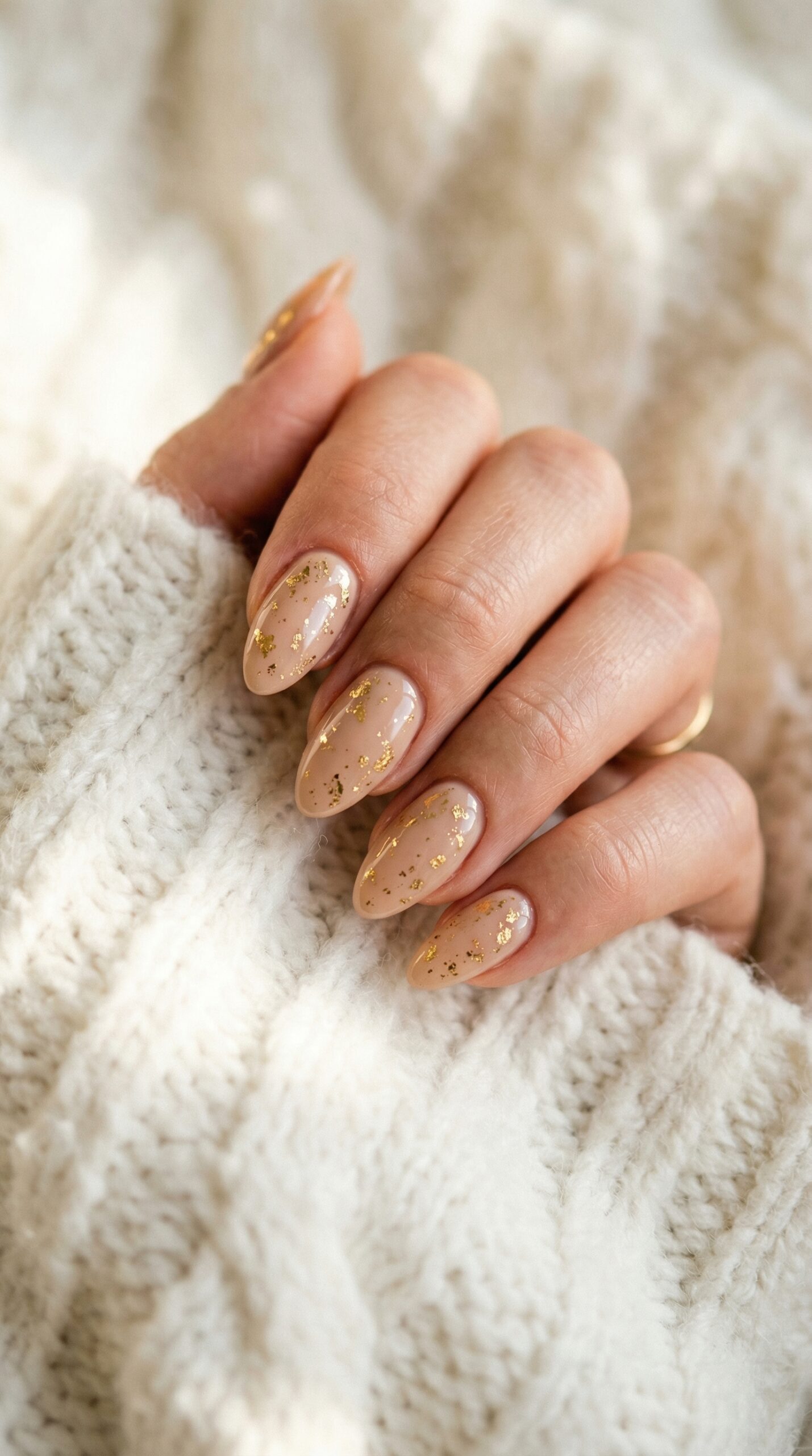 Gold flakes shimmer over nude tones. Subtle luxury in every detail.