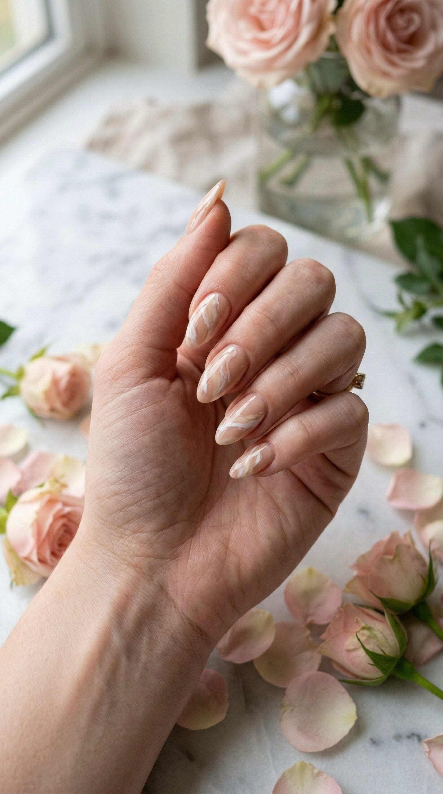 Swirling marble patterns add depth. Neutral tones keep it elegant.