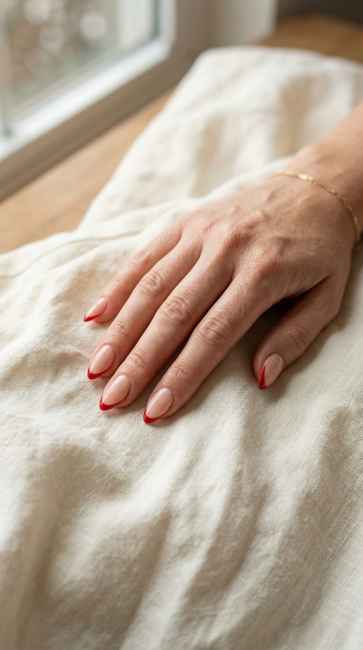 Thin red tips create contrast on nude base. Clean and sharp design.