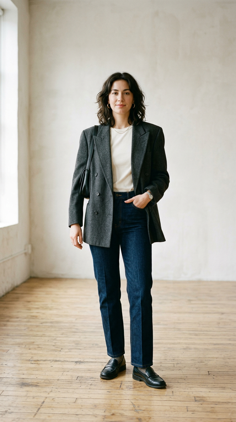 The blazer drapes loosely with sharp lapels. It balances structure with relaxed proportions.