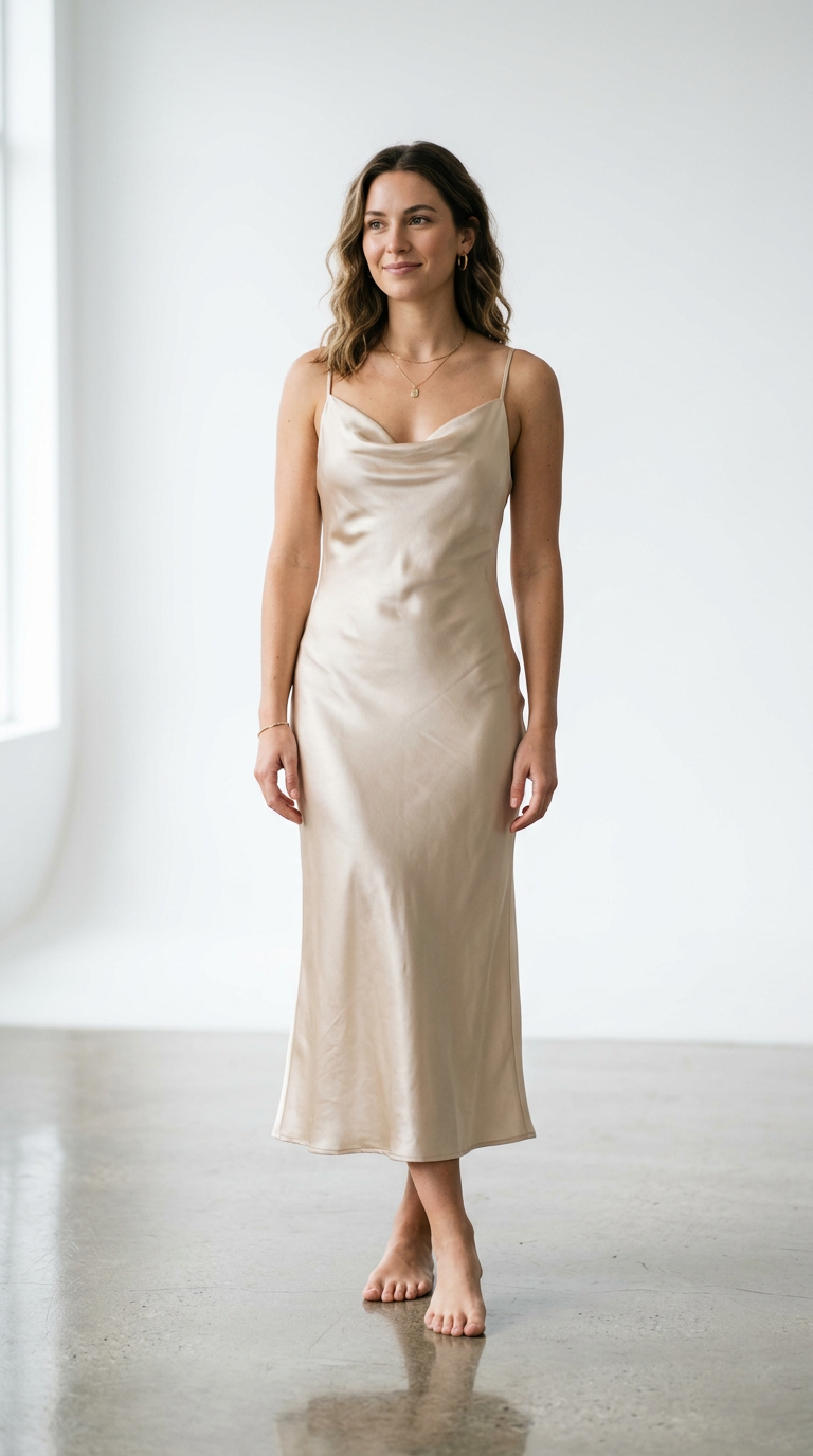 The satin glides softly over the body, catching light with every movement. Thin straps and a fluid silhouette create a barely-there elegance.