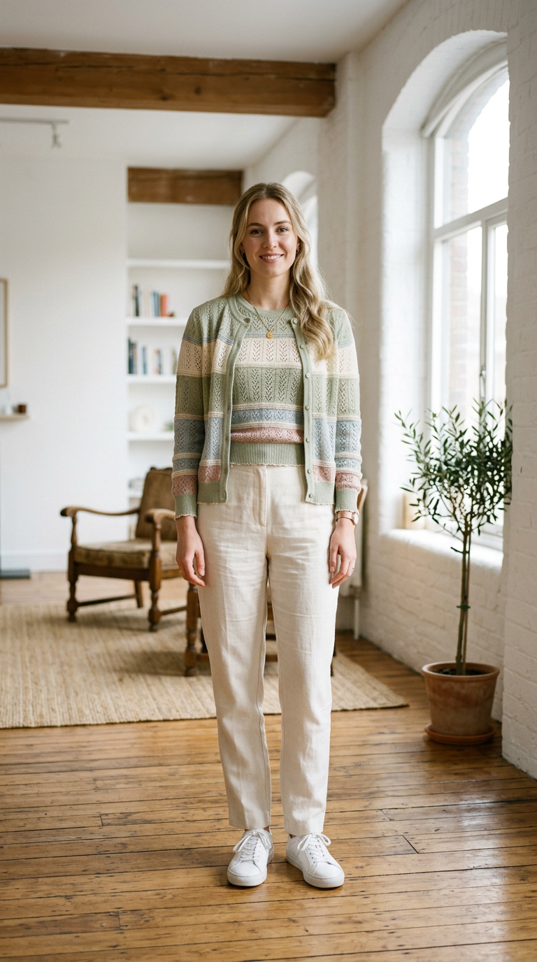 The cardigan fits snugly while the skirt flows. Soft tones create harmony.