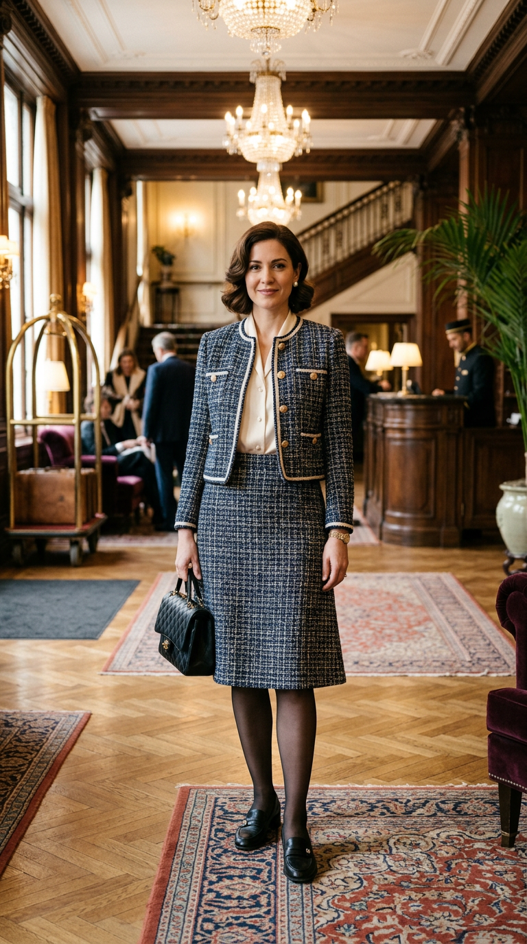 Textured tweed adds richness and depth. The cropped silhouette keeps it sharp.