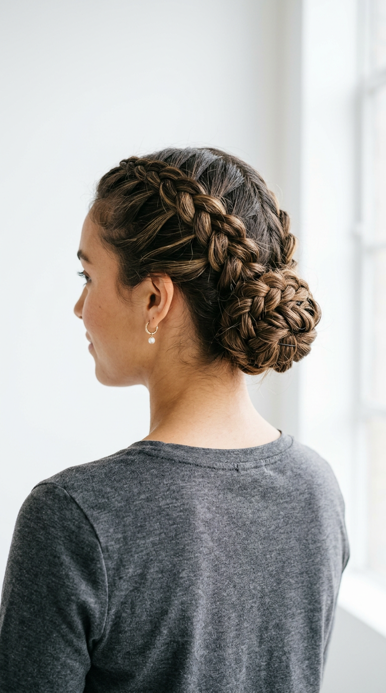 A braid wraps into a structured bun at the back. Texture adds depth and interest.