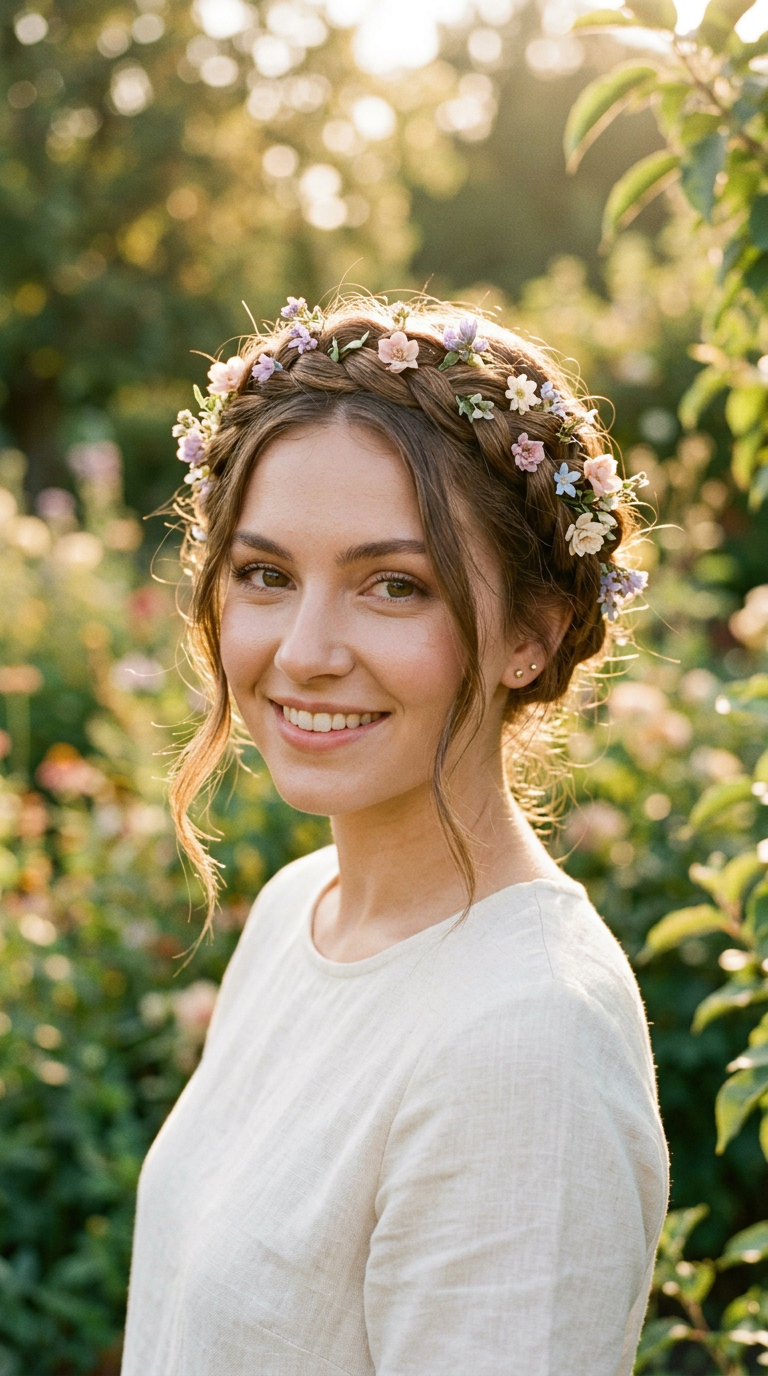 Soft braids wrap gently around the head, decorated with tiny pastel blooms. Loose strands soften the look with airy texture.