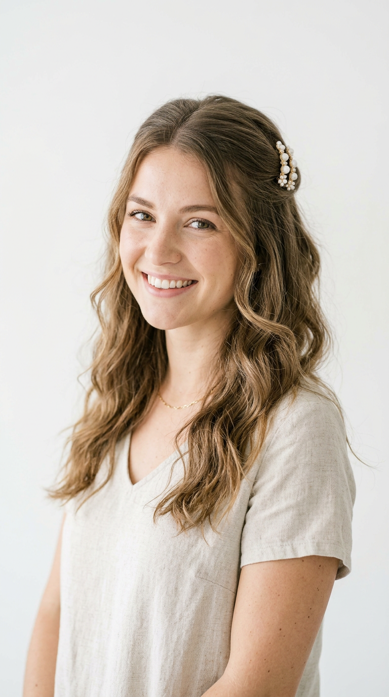 The top section is pulled back and secured with pearl clips. Soft waves flow freely underneath.