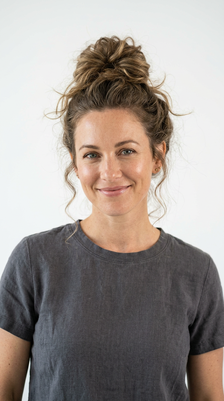 Hair is piled loosely on top with soft flyaways. The finish is intentionally undone.