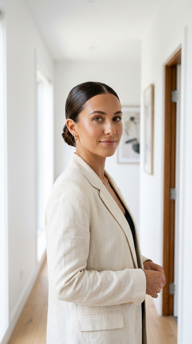 Hair is smoothed tightly into a low bun. The finish is glossy and clean.