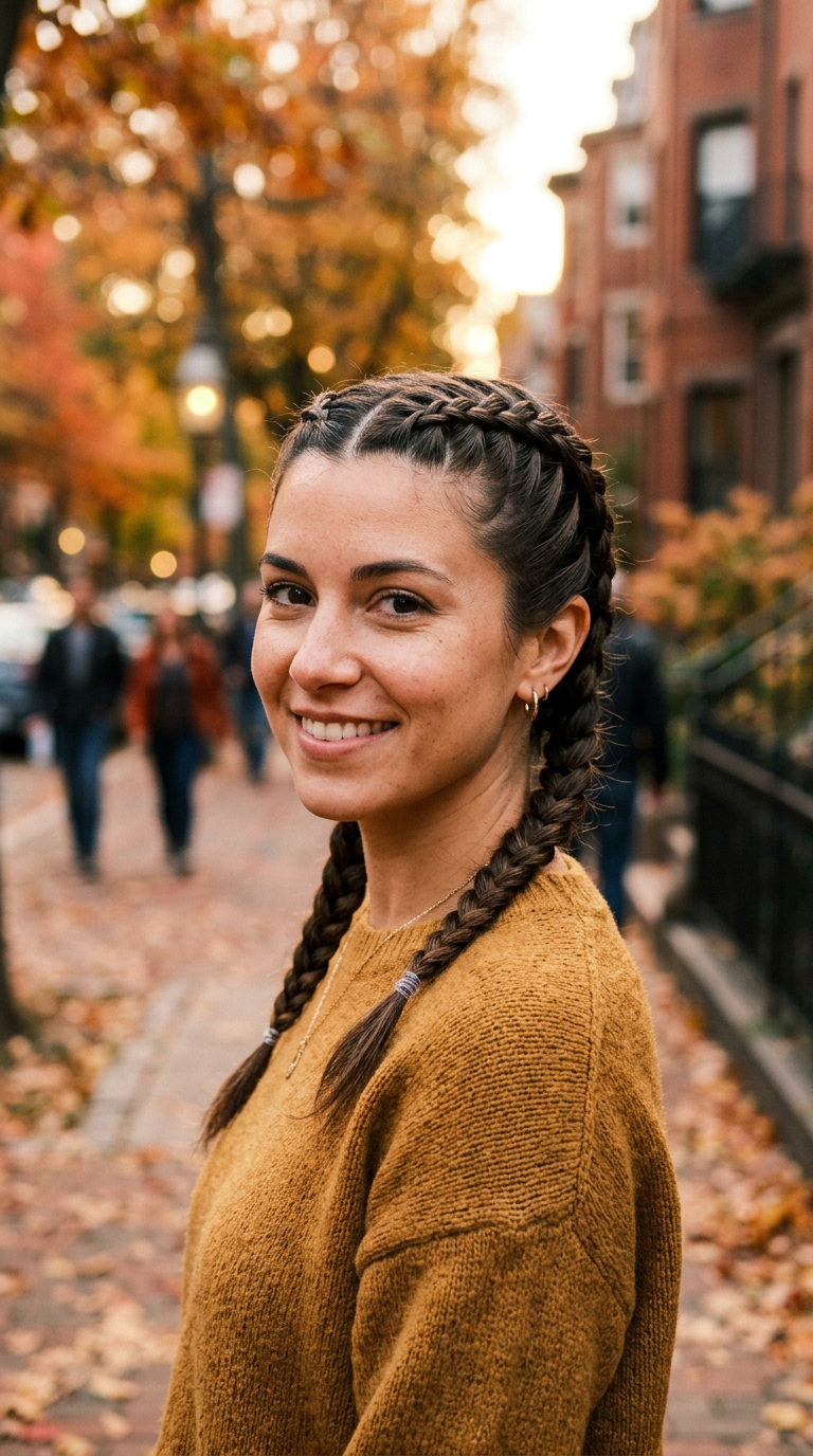 Two braids run close to the scalp with defined structure. The finish is neat and sculpted.