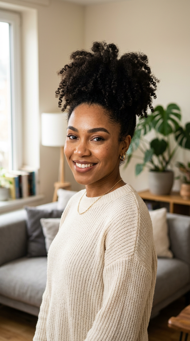Curls are gathered high into a voluminous puff. The texture is bold and defined.