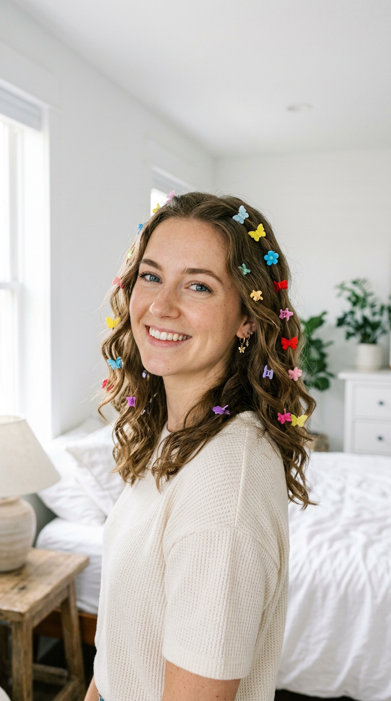 Tiny clips are scattered through loose waves. They add pops of color and charm.