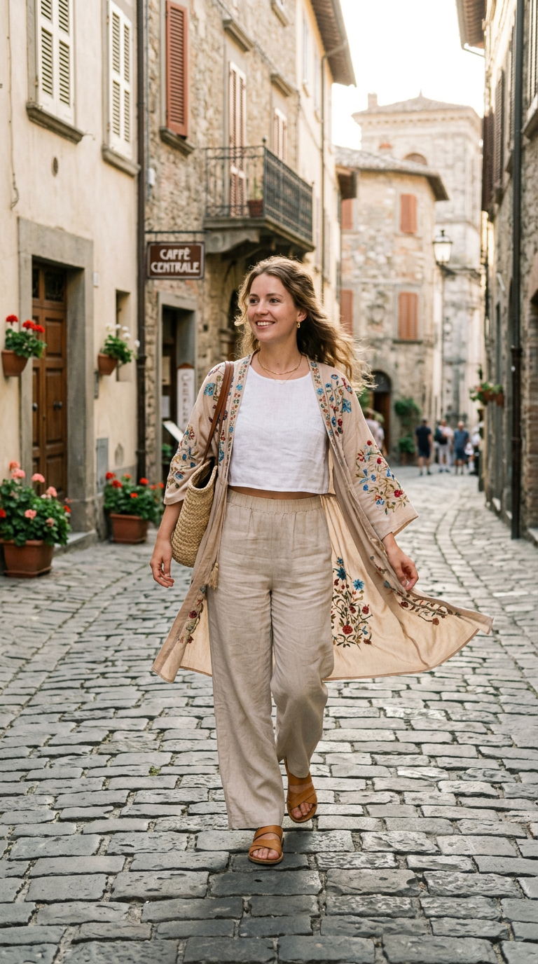 Soft beige linen flows effortlessly with every step, paired with a breezy white blouse. The embroidered kimono adds depth through delicate stitching and movement.
