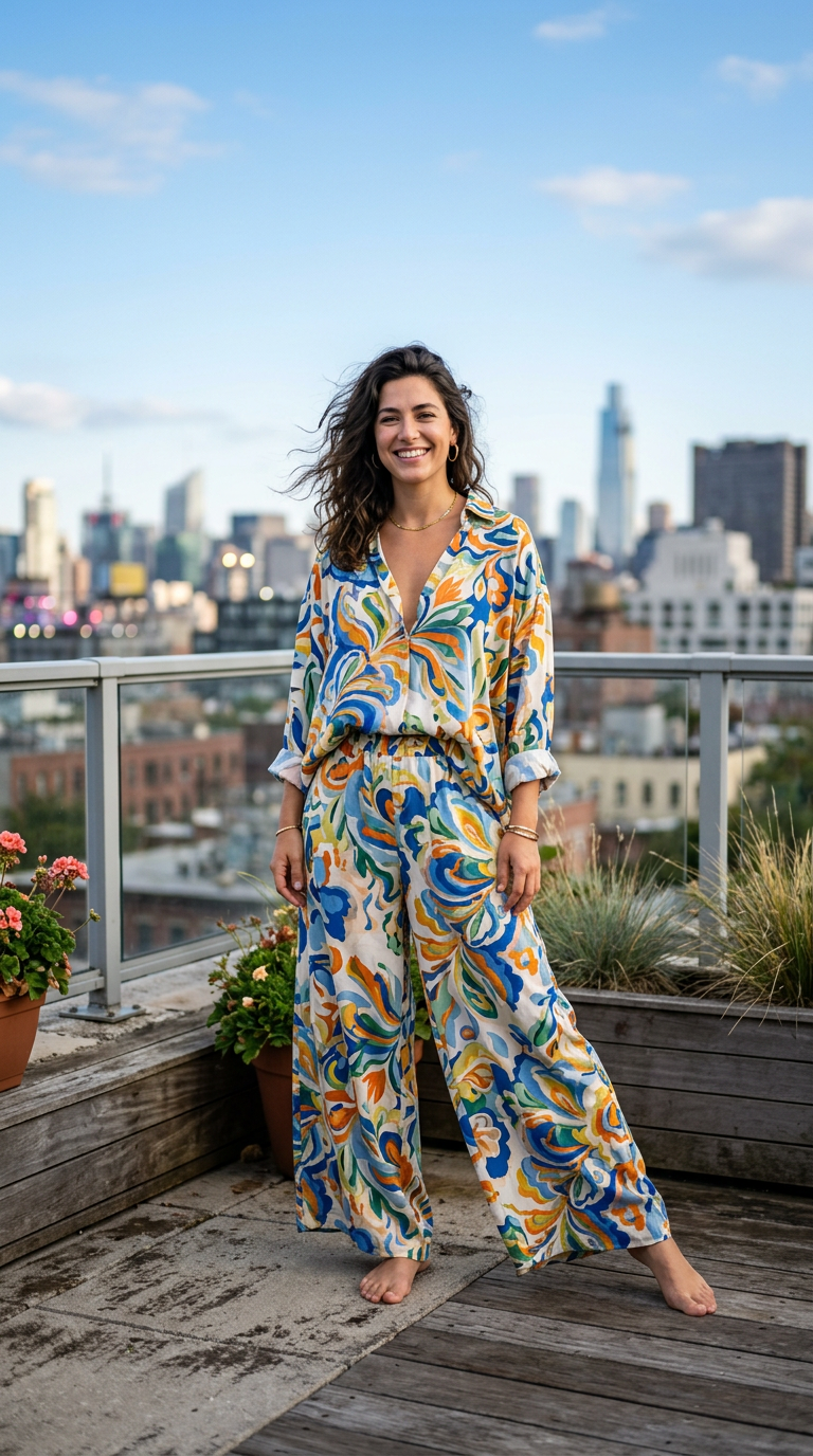 Flowy wide-leg pants create movement. Prints bring vibrancy.