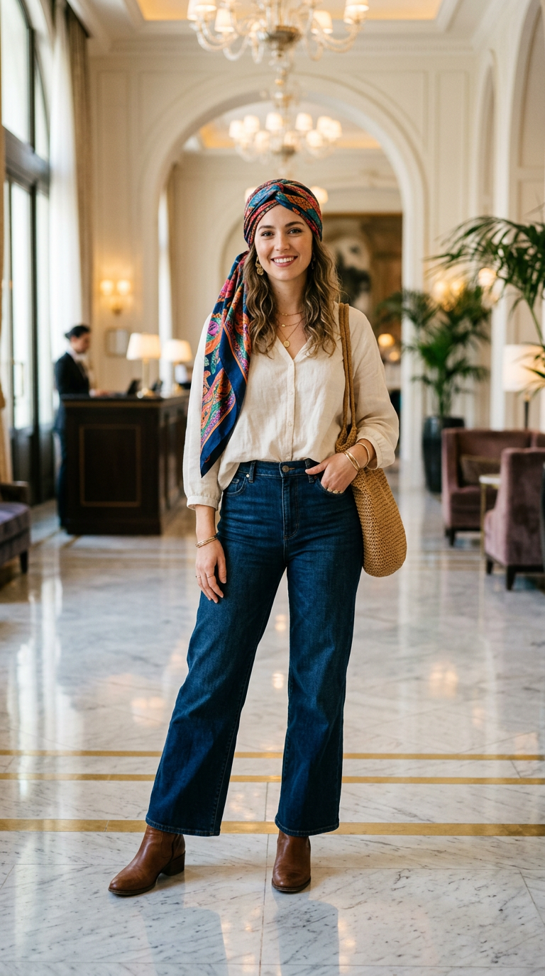 A vibrant scarf elevates the outfit. It adds color instantly.