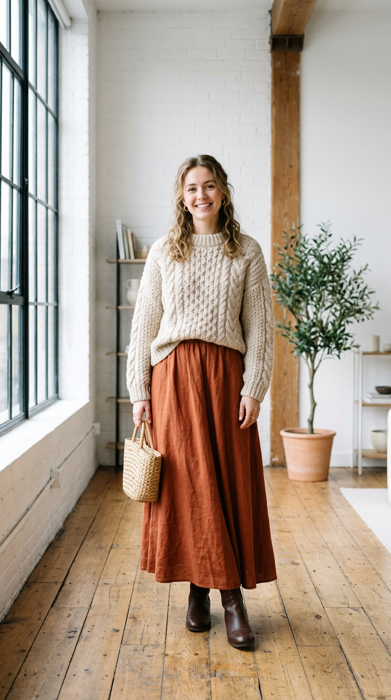 Chunky knit contrasts with flowy fabric. Textures stand out.
