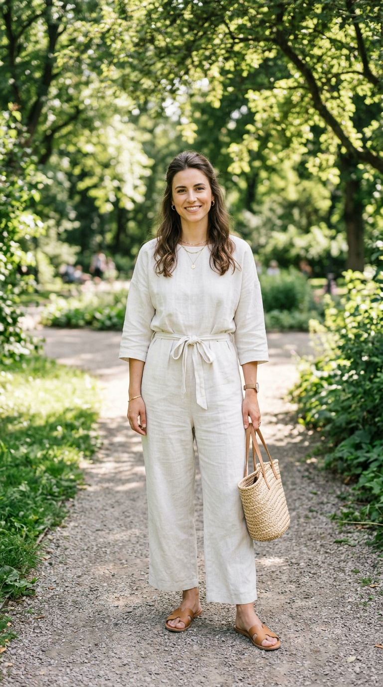 This look flatters warm and neutral skin tones beautifully. Perfect for summer strolls or casual outdoor gatherings.