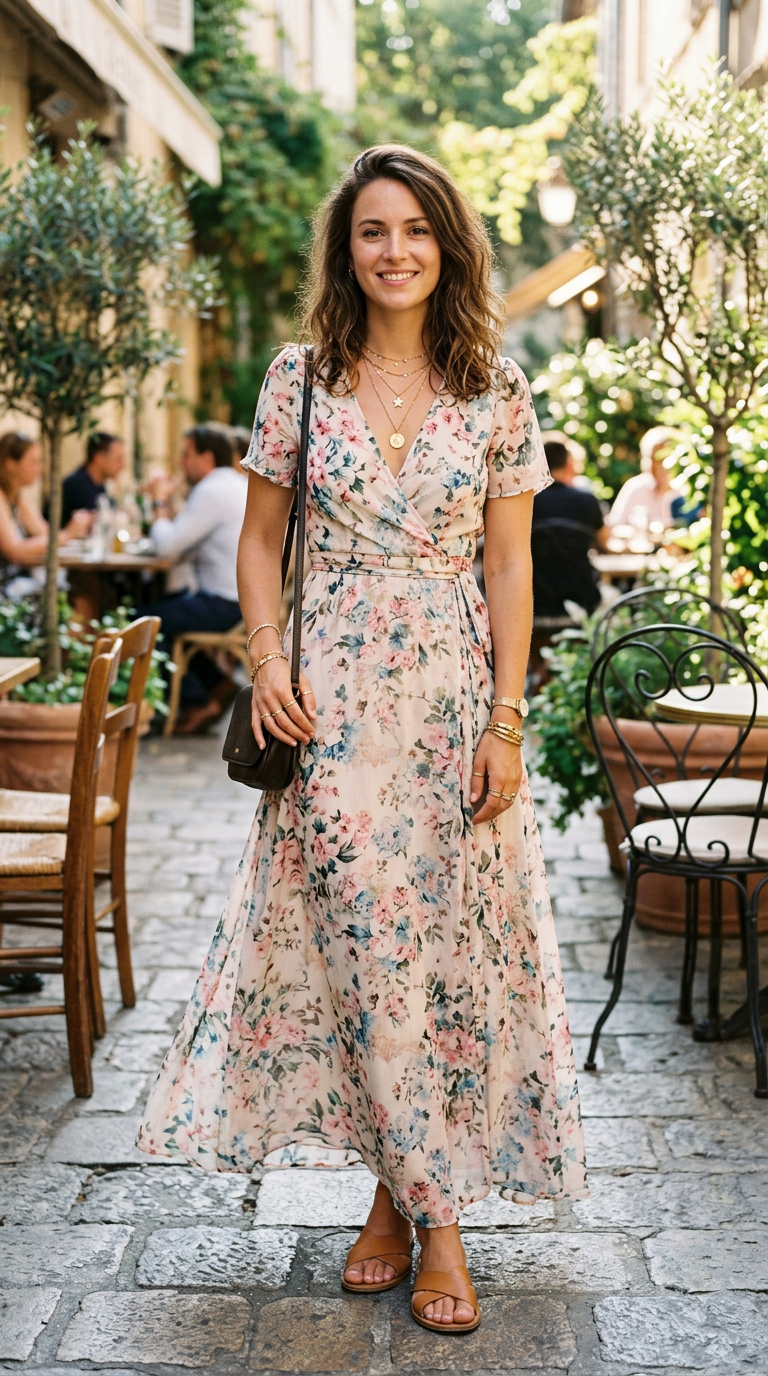 A soft floral maxi cascades with every step. The chiffon fabric feels light and airy.