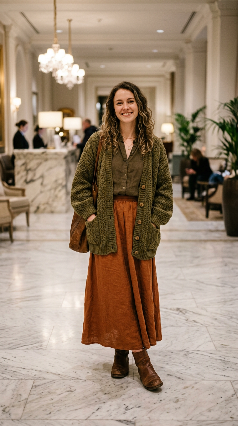 There’s a calm, grounded energy to this outfit. It feels peaceful yet quietly confident.