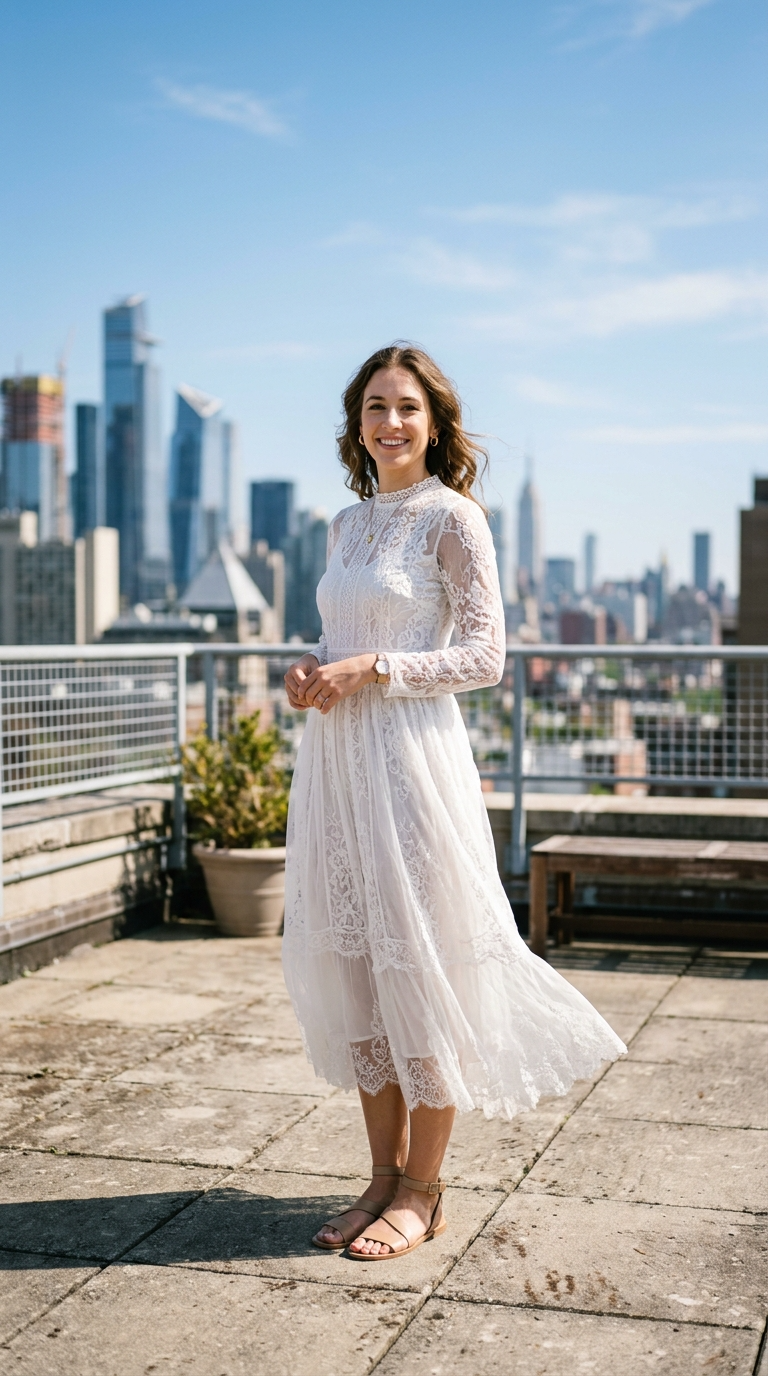 Delicate lace textures create softness and elegance. The sheer layers add dimension.