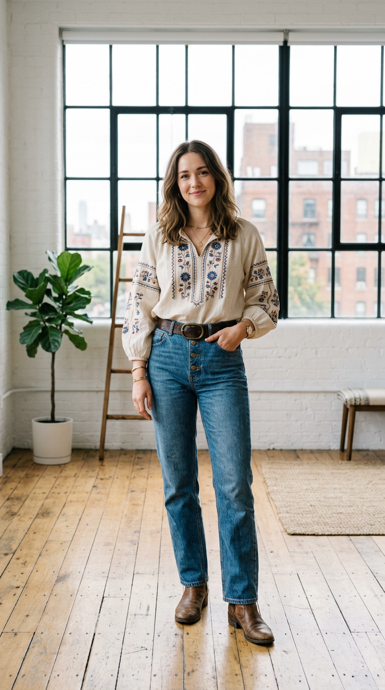 Classic denim pairs with soft embroidery for contrast. The textures feel balanced and authentic.