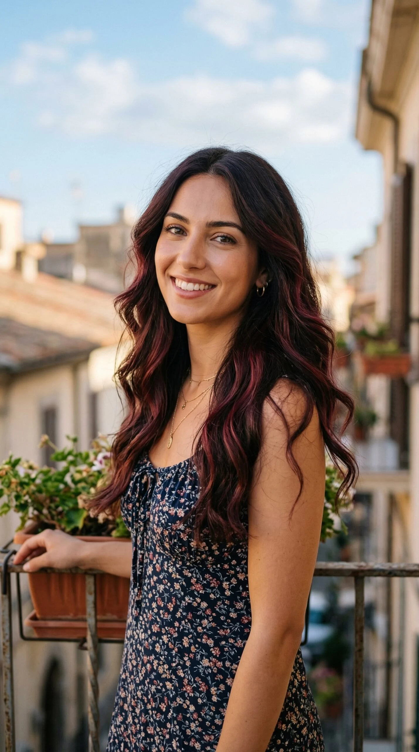 Dark brunette roots melt gradually into burgundy balayage highlights. The waves reveal flashes of wine-red dimension.