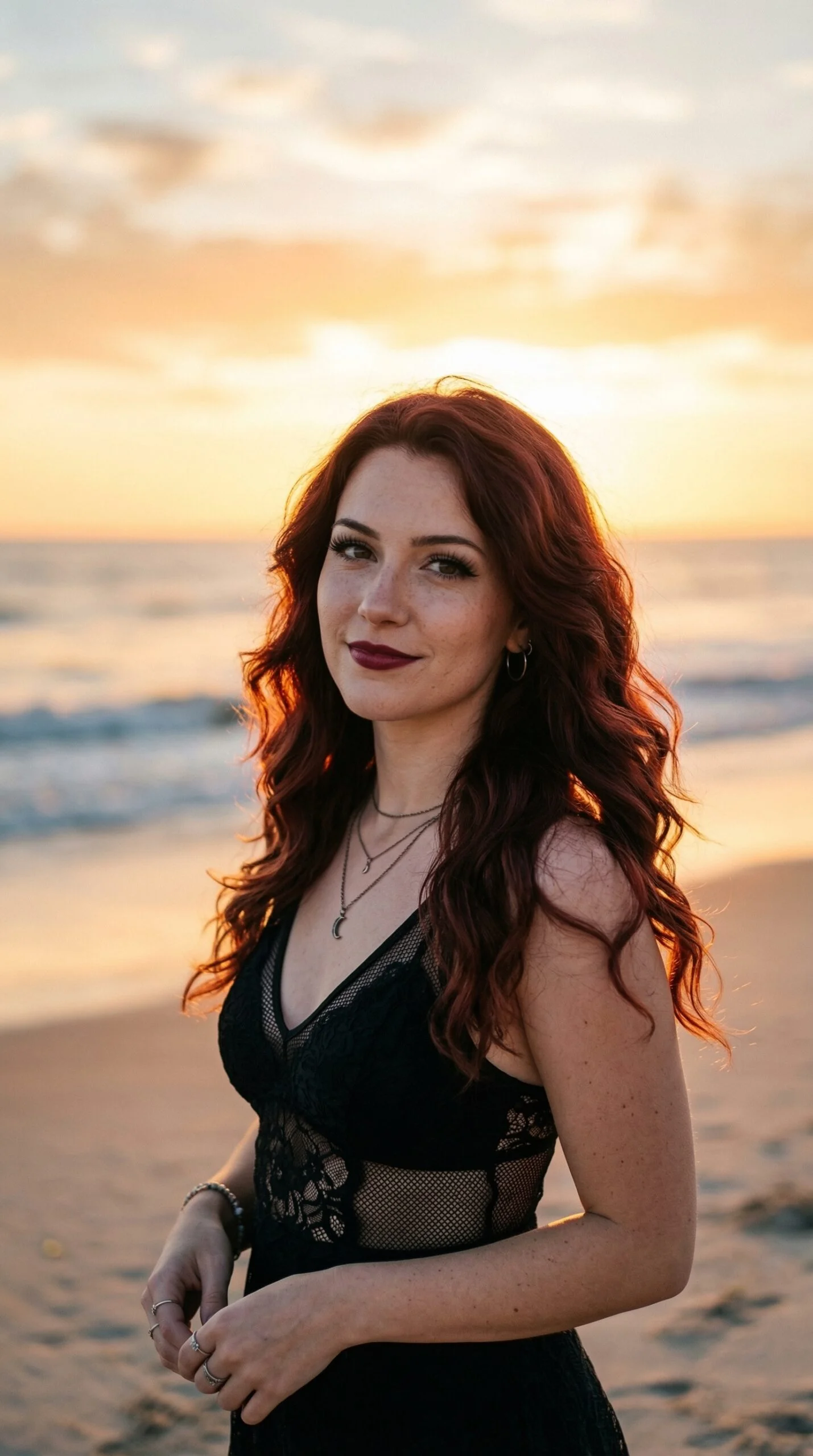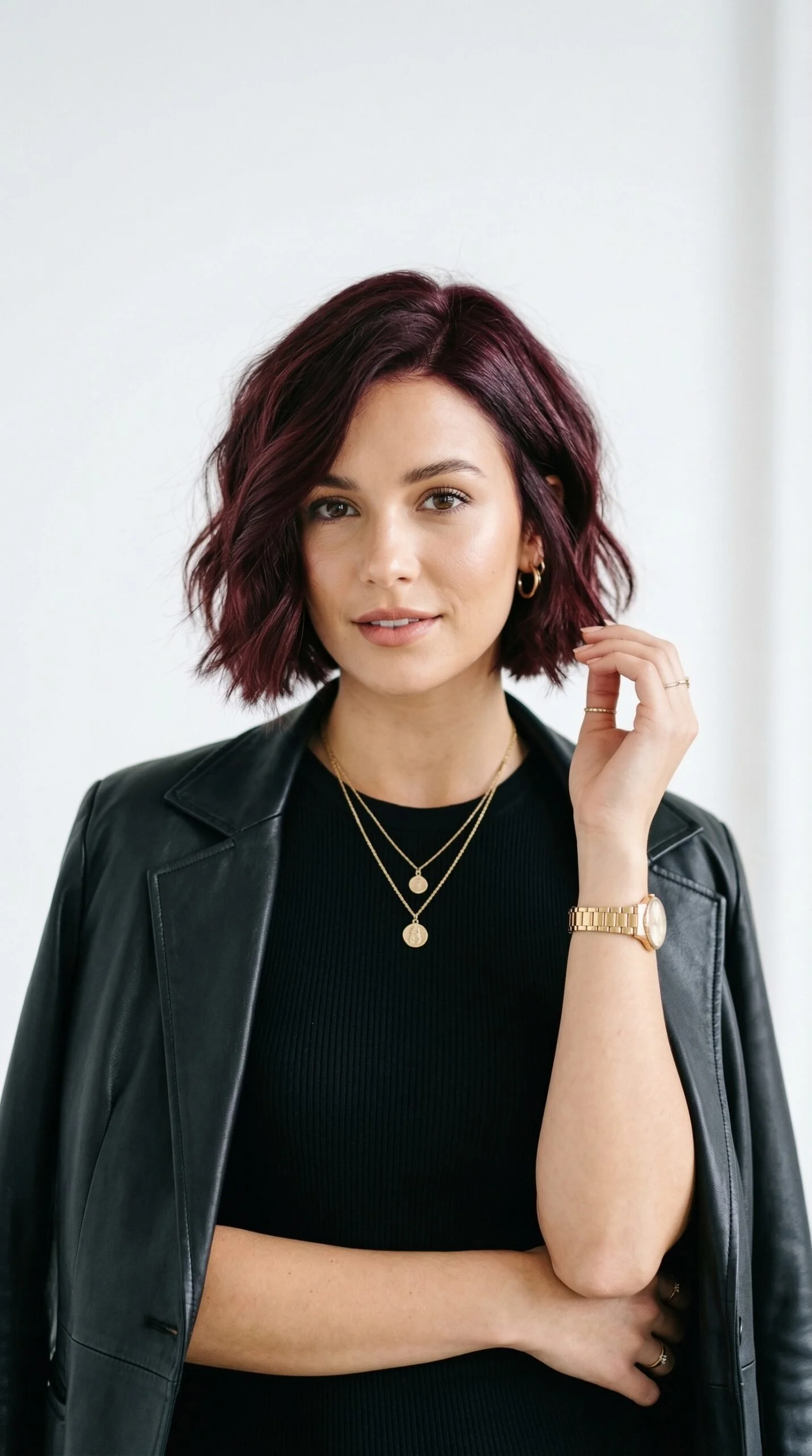 The mood feels timeless and elegant. It brings a red carpet energy to burgundy hair.