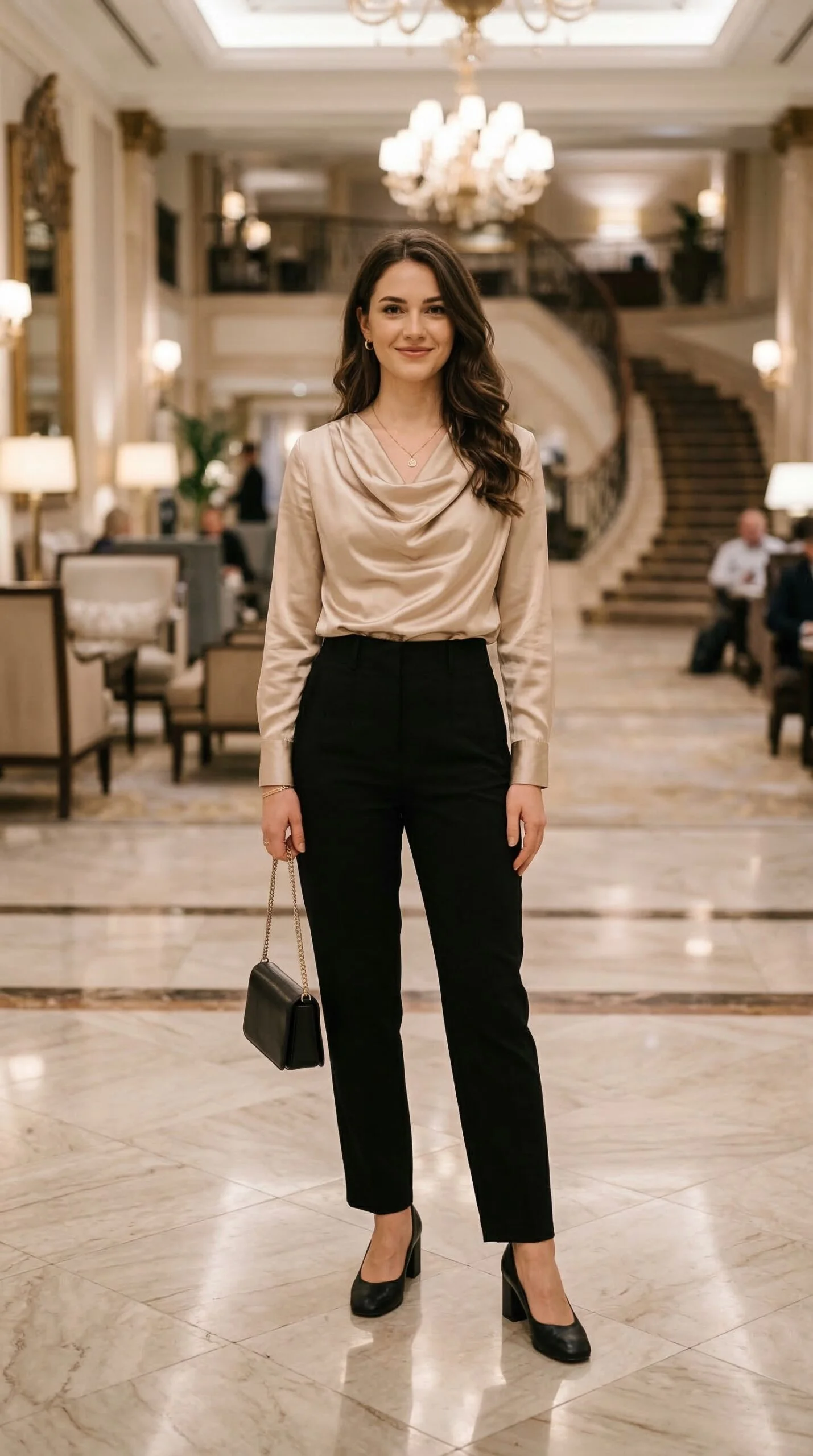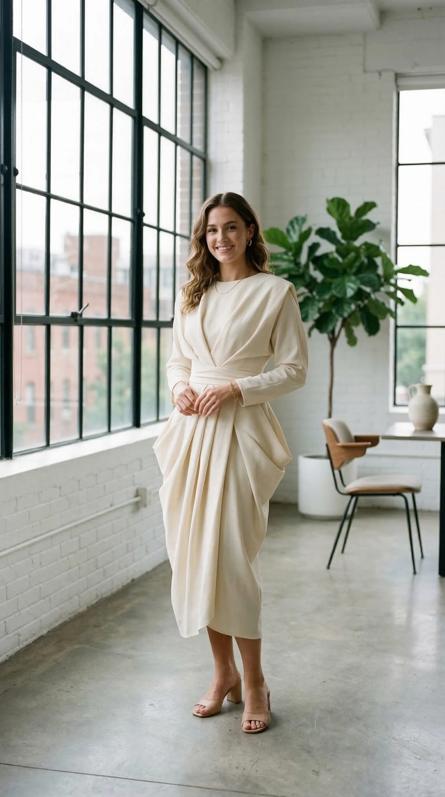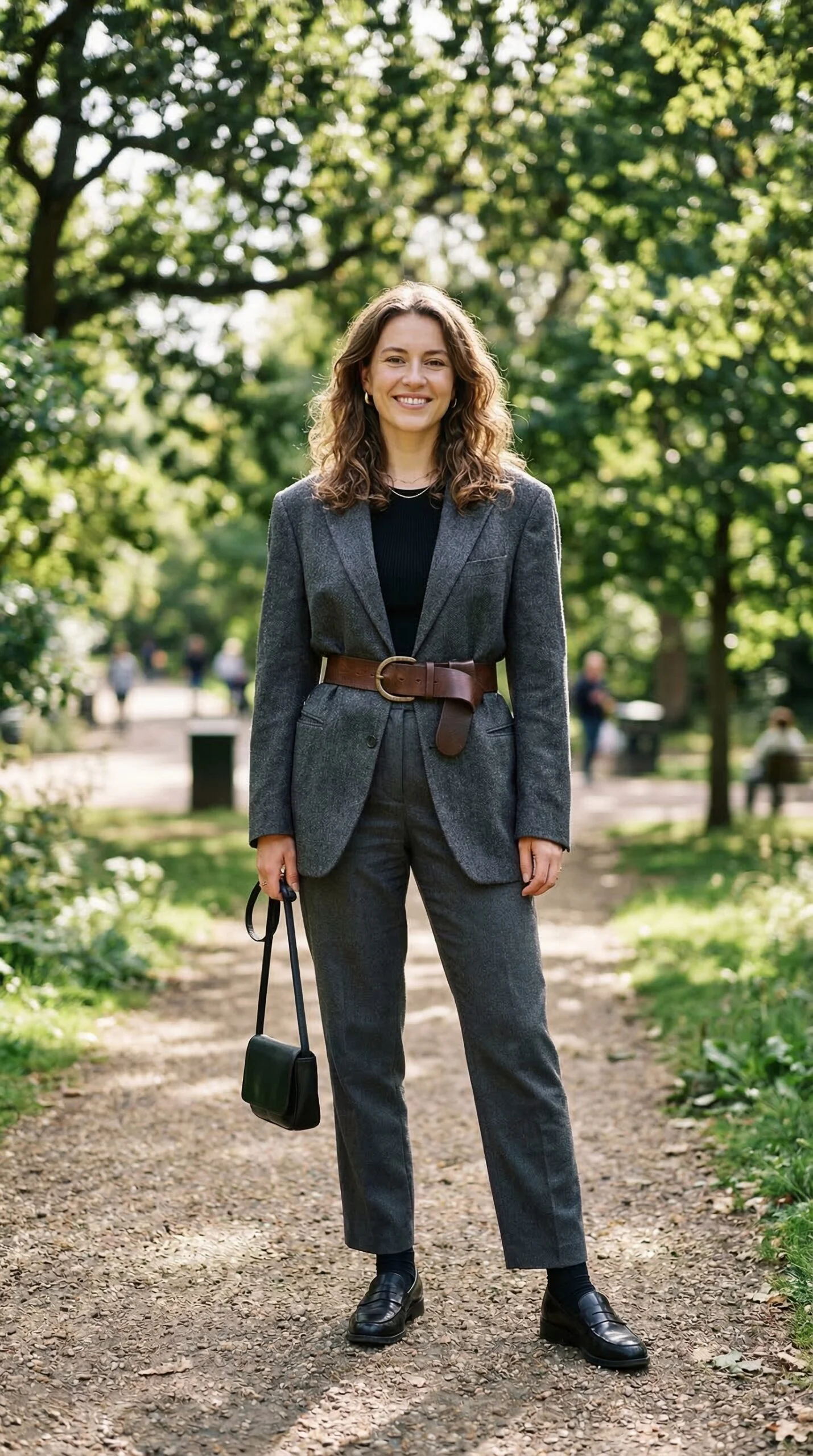 This look suits many skin tones and works beautifully for brunch, workdays, or creative meetings. It flatters both petite and tall silhouettes.