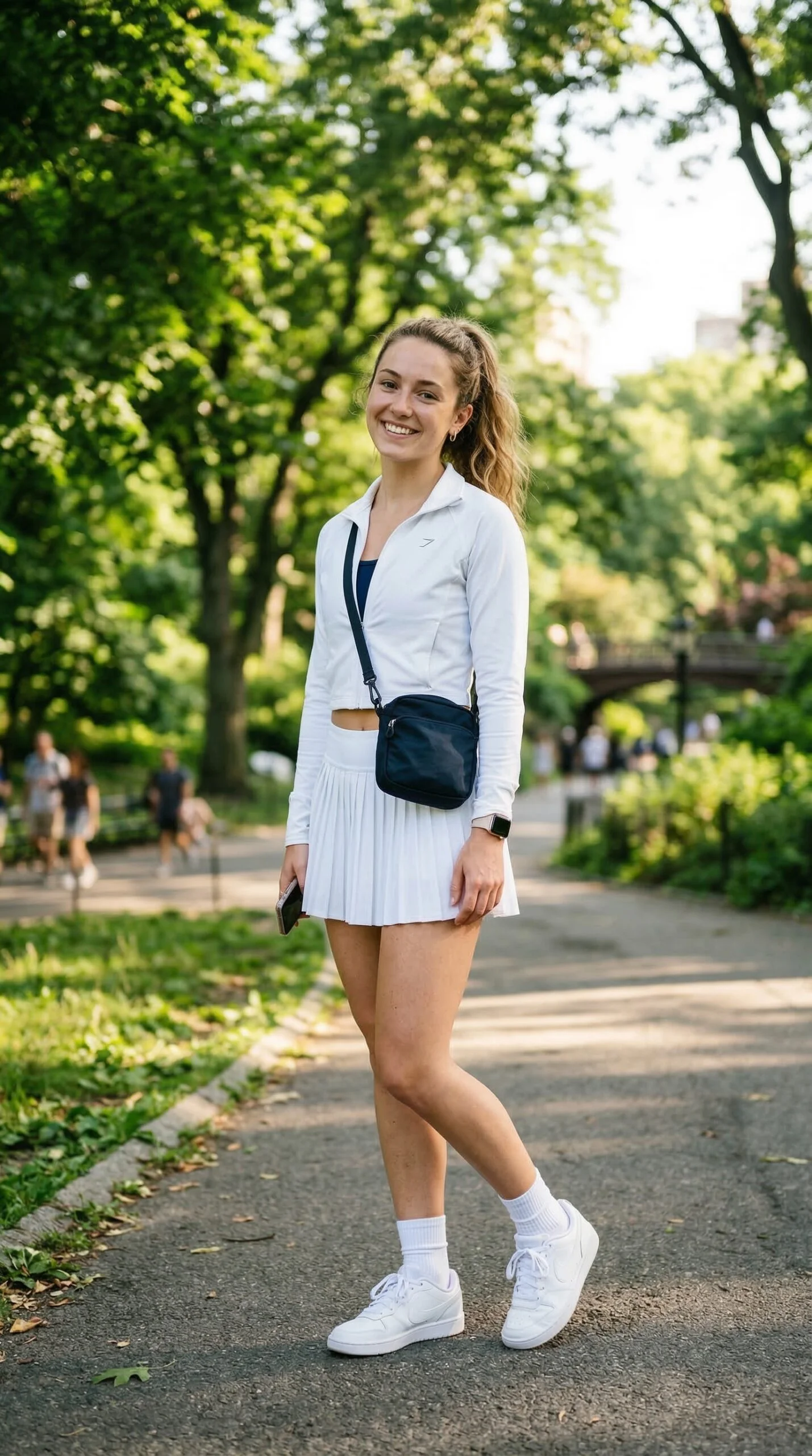 Crisp pleats create energetic movement with each step. The sporty jacket completes the athletic vibe.