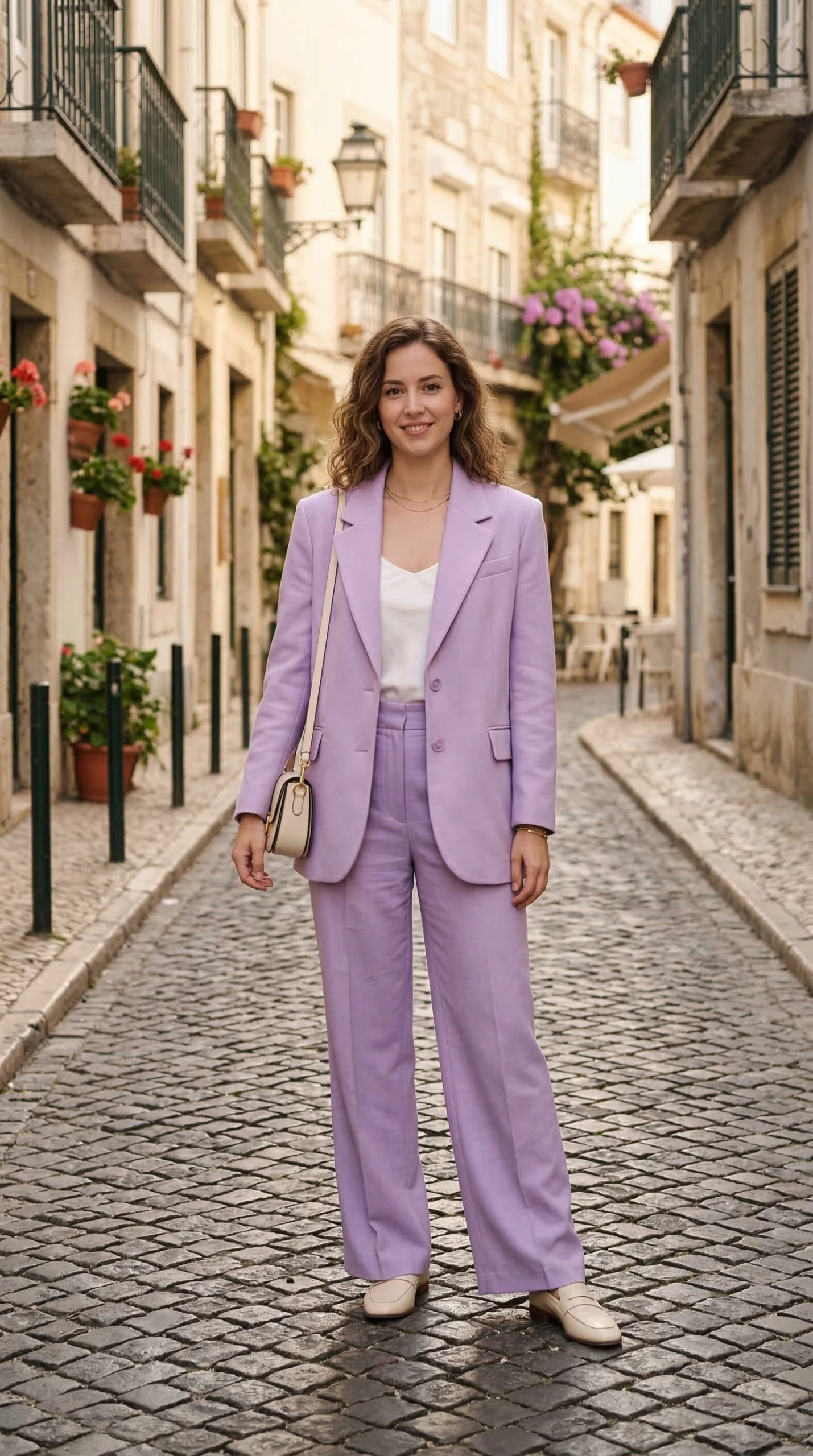 Soft lavender tailoring instantly feels fresh and optimistic. The oversized blazer balances perfectly with flowing wide-leg trousers.