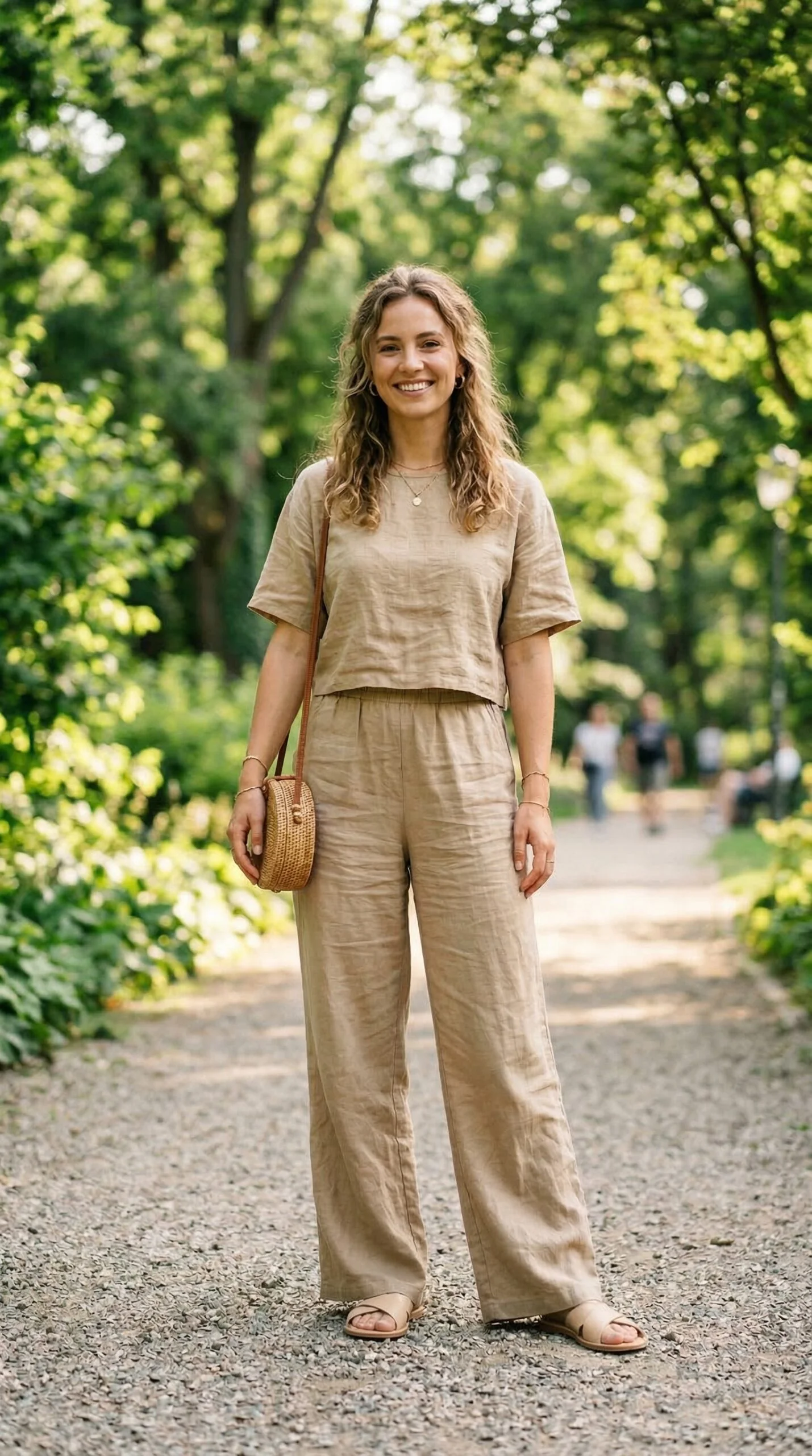 Natural linen fibers create soft texture across the outfit. The relaxed trousers move effortlessly.