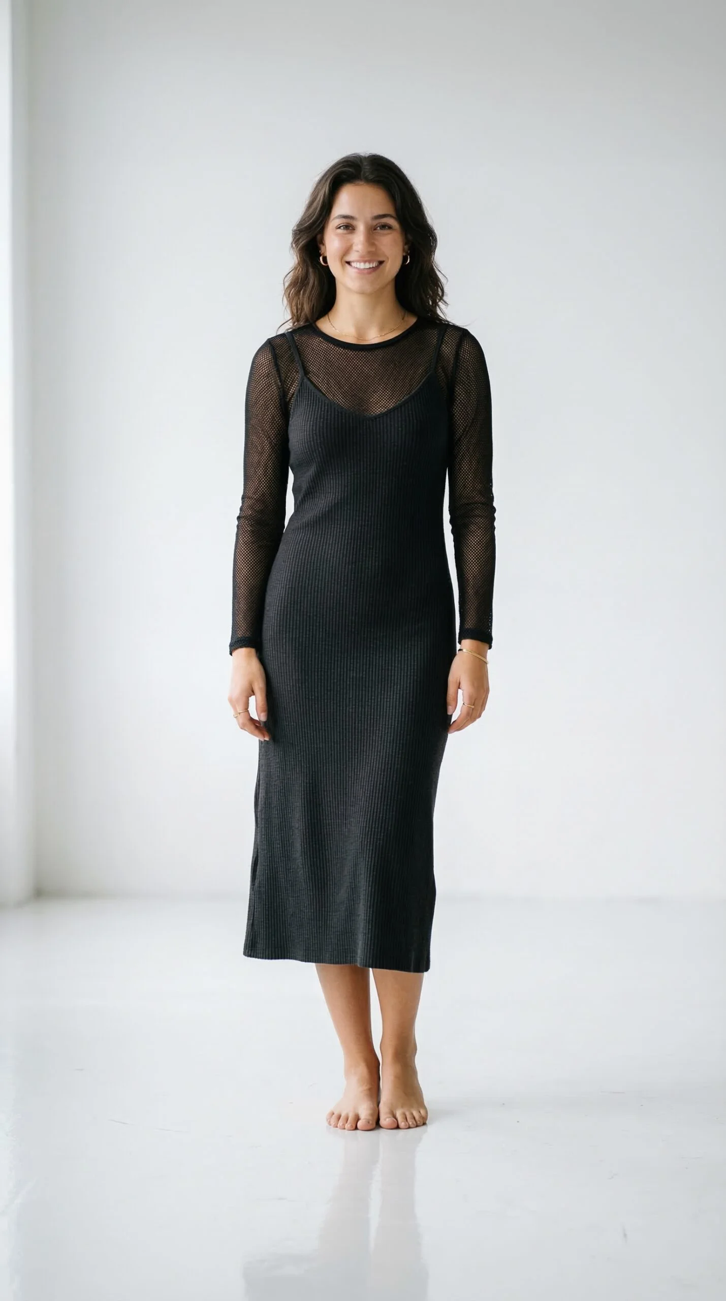 Ribbed knit fabric hugs the silhouette gently. The sheer mesh layer adds visual depth.