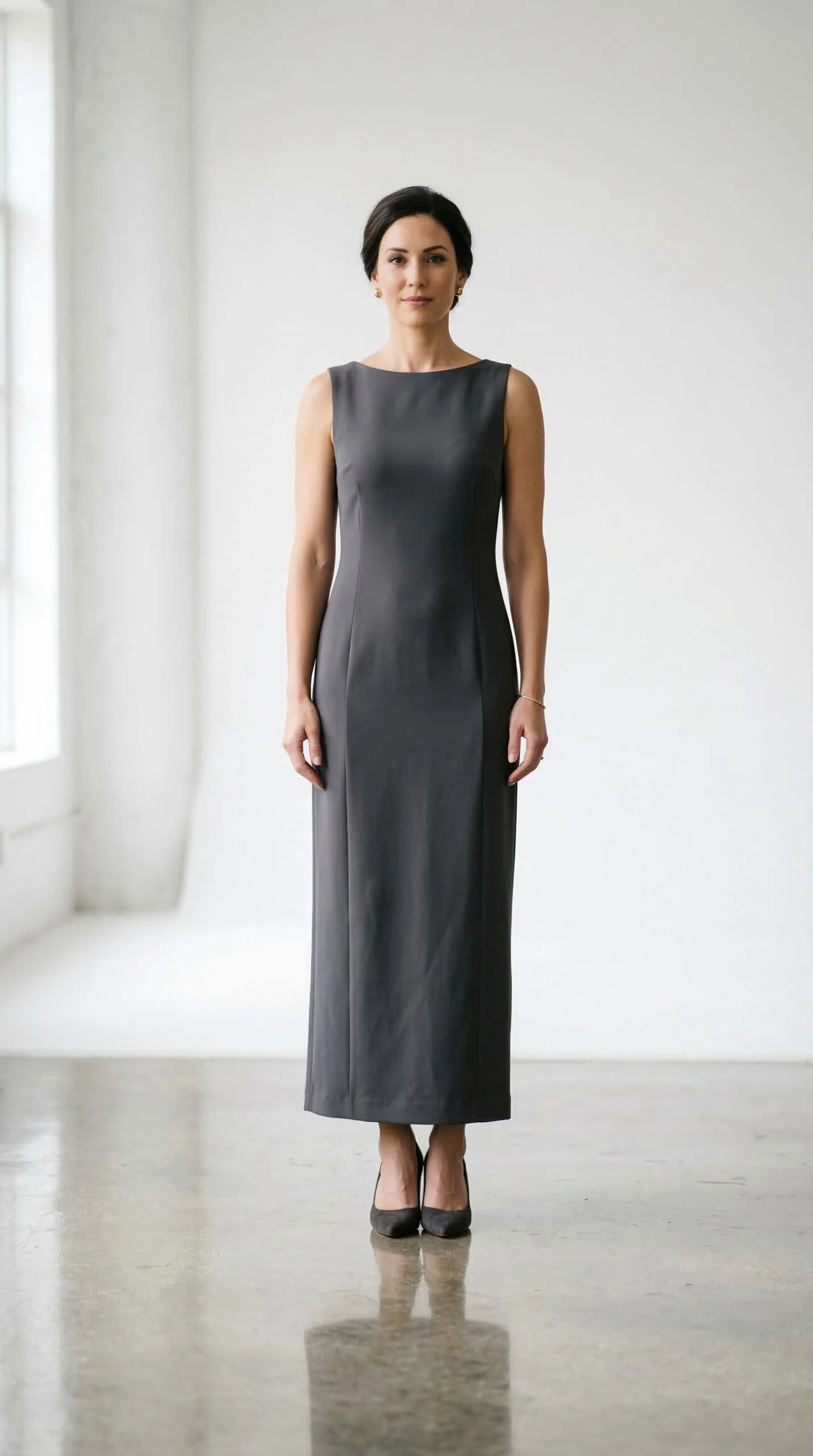 Long vertical lines elongate the silhouette beautifully. The dark charcoal fabric feels modern.