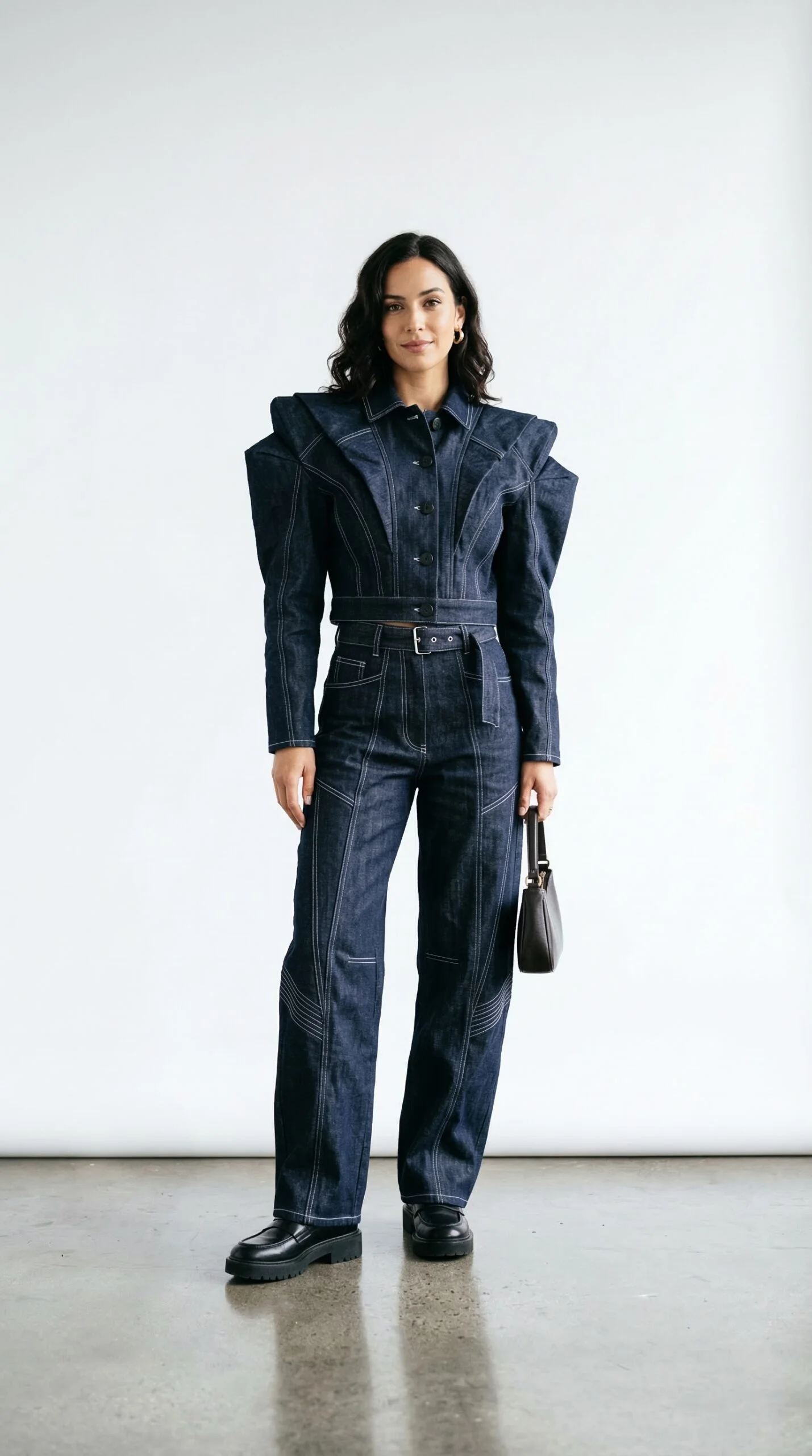 Sharp seams and bold shoulder shapes give denim dramatic architecture. The rich indigo fabric highlights every contour.