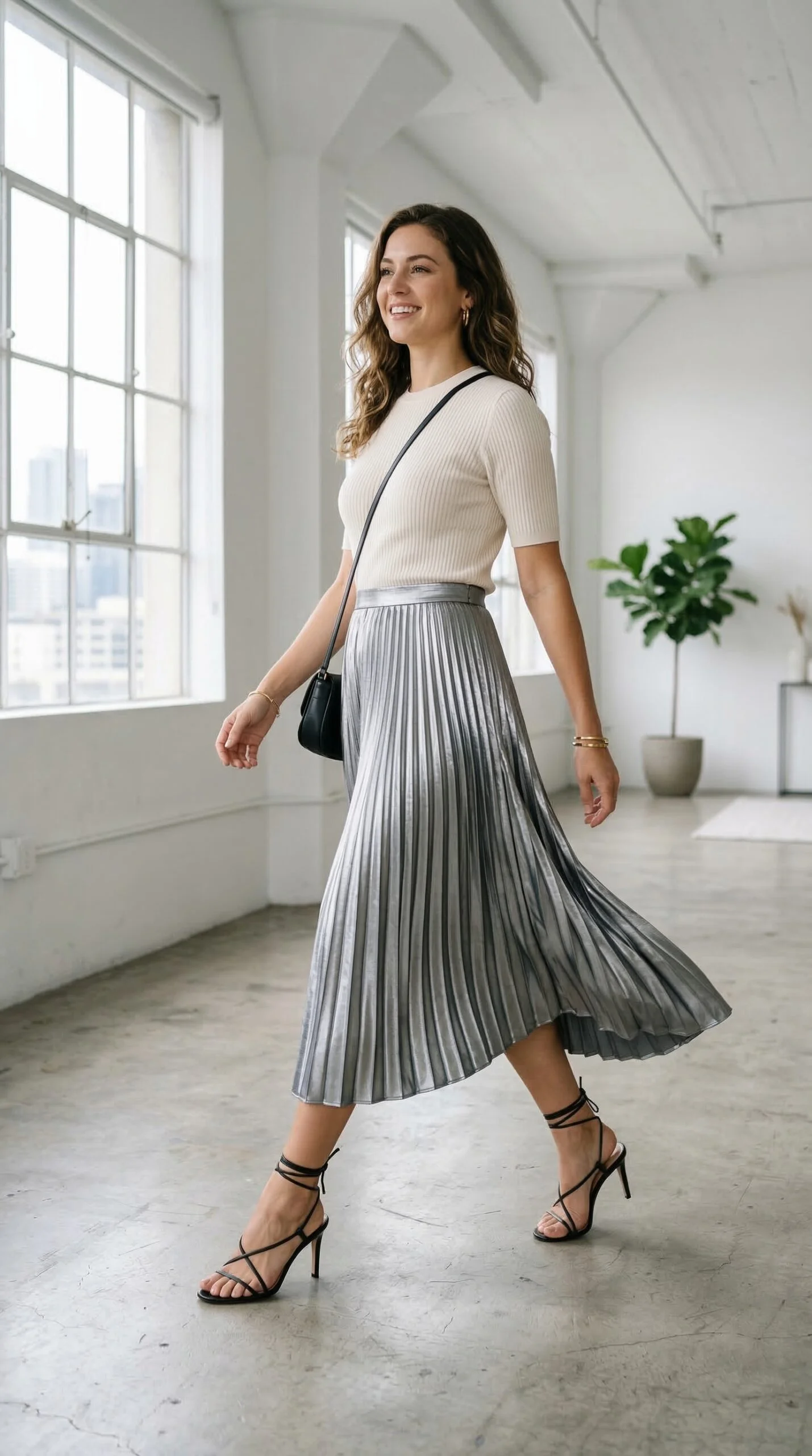 The metallic pleats catch light with every step. Silver tones shimmer across the crisp folds.