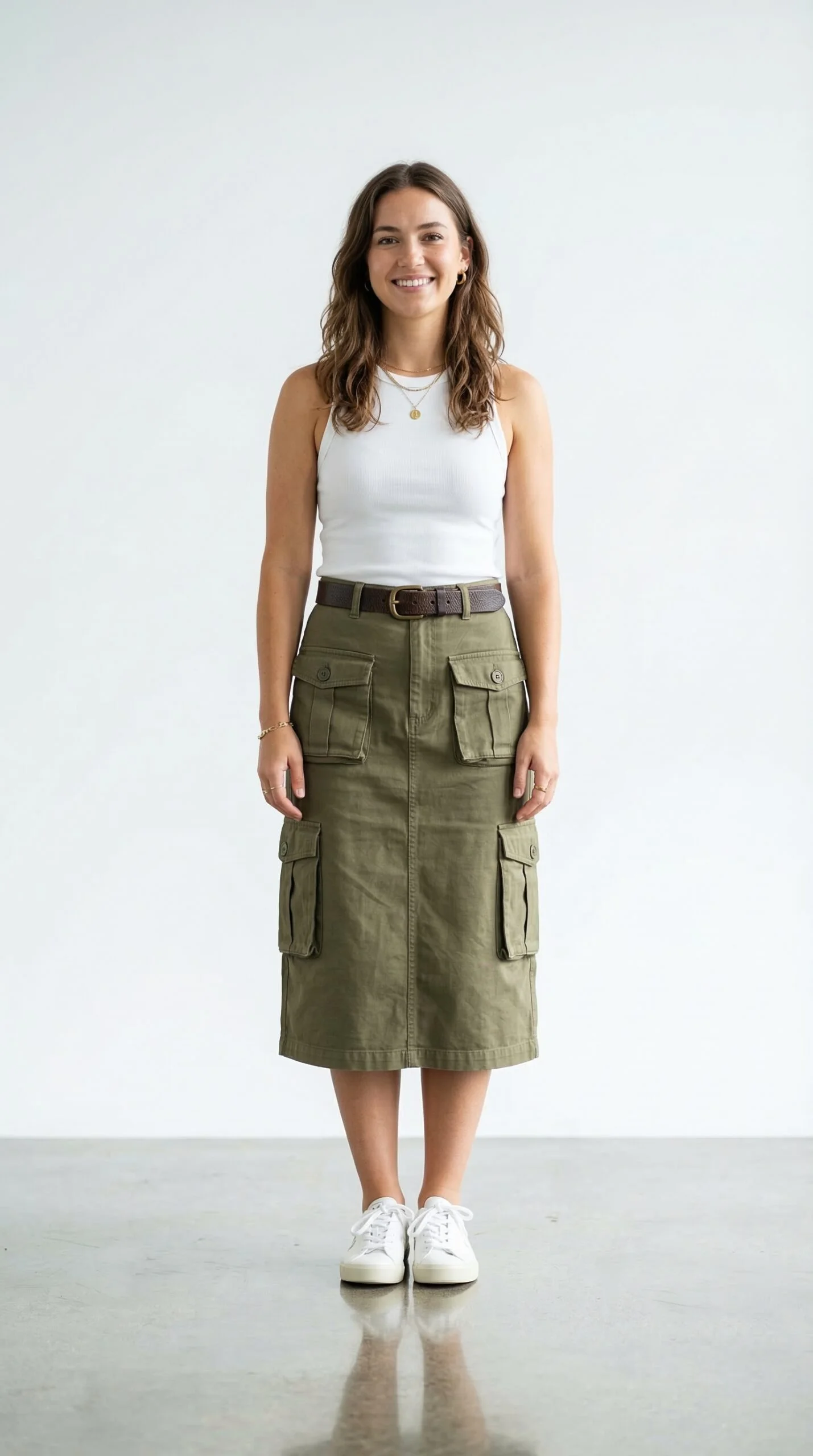 Structured cargo pockets give the skirt a utilitarian edge. The midi length balances practicality with style.