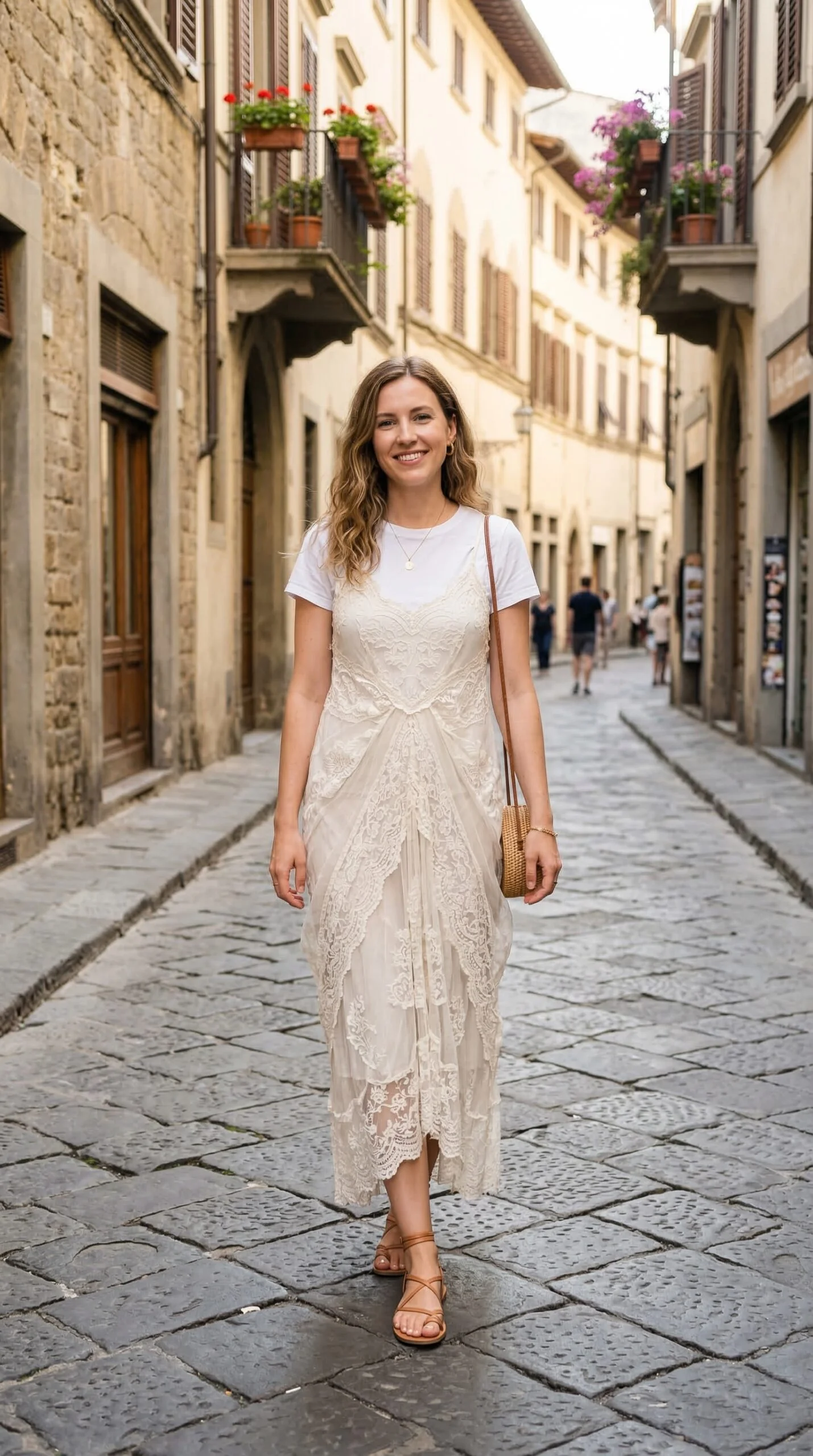 Fine lace patterns shimmer subtly across the soft slip silhouette. The layering over a crisp tee creates contrast between delicate and casual.